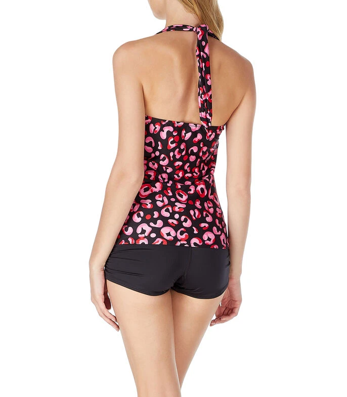 Tankini Barocco en tejido de punto con diseño de animal print, copa suave, letra V al centro del escote y tirantes ajustables al cuello. Short a contraste elástico.