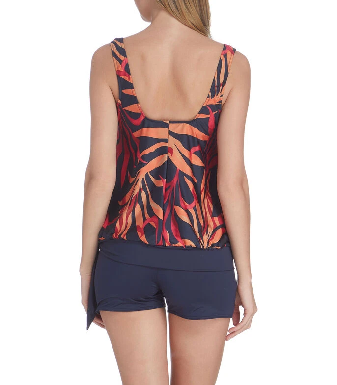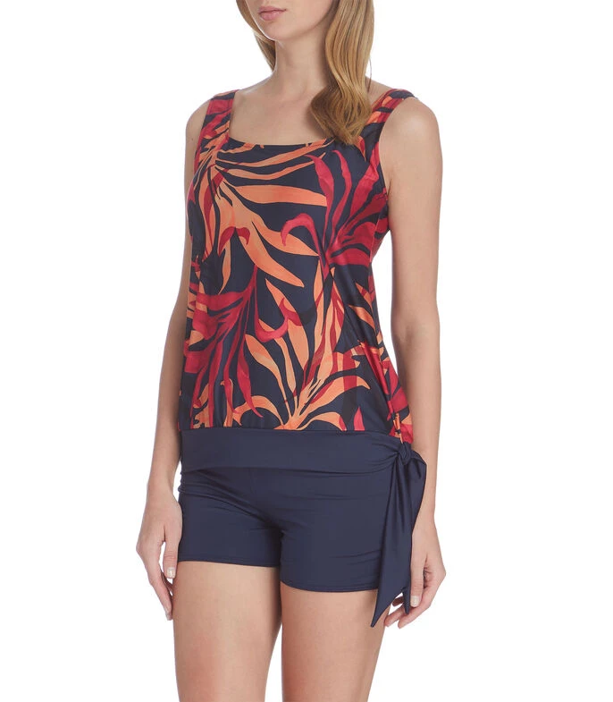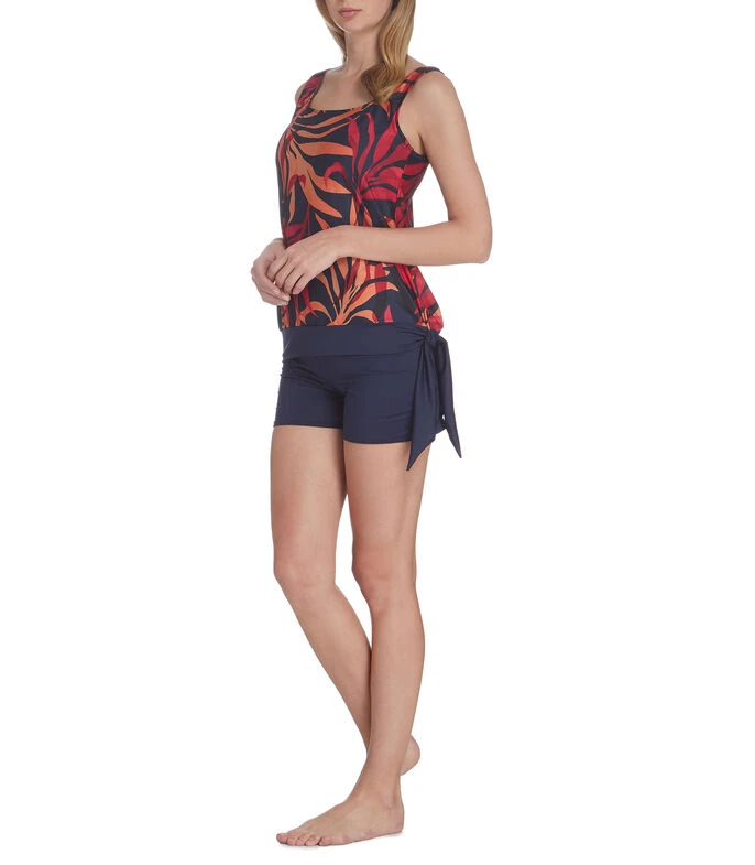 Tankini Barocco en tejido de punto con diseño decorativo de hojas, cuello cuadrado, tirantes anchos y detalle de cinta en costado. Short con pretina elástica.