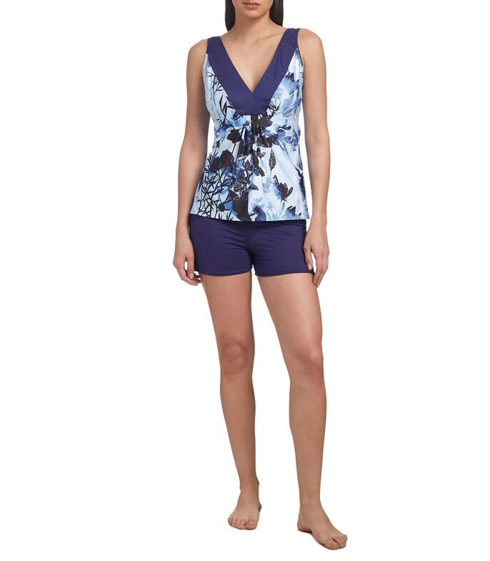 Tankini Barocco en tejido plano con estampado floral, cuello V, sin mangas y bottom con pretina elástica.