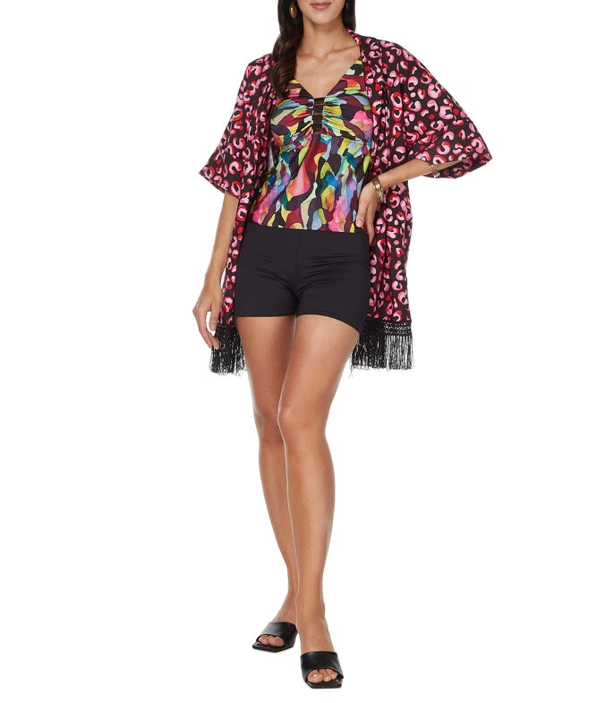 Tankini Barocco Serpentina en tejido de punto con top estampado, escote V con cintas, tirantes delgados ajustables y sin mangas. Top con pretina elástica.