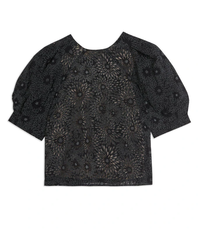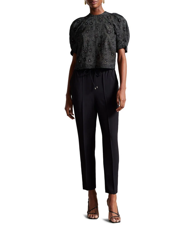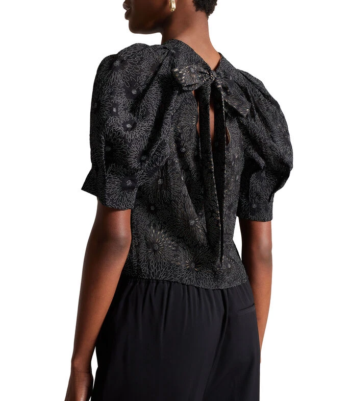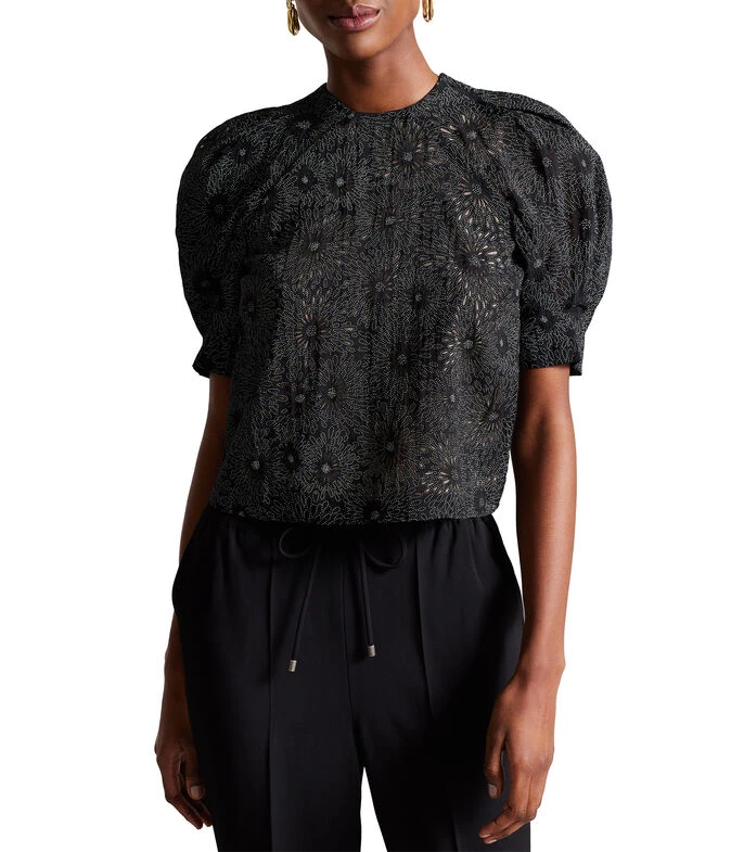 Blusa Top Ted Baker Ingrid, de corte regular en tejido de punto, cuello redondo, manga corta abullonada, estampado floral y escote V en la espalda con cintas ajustables.