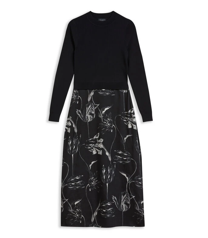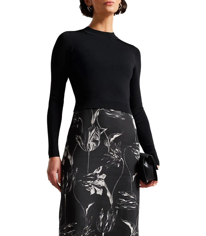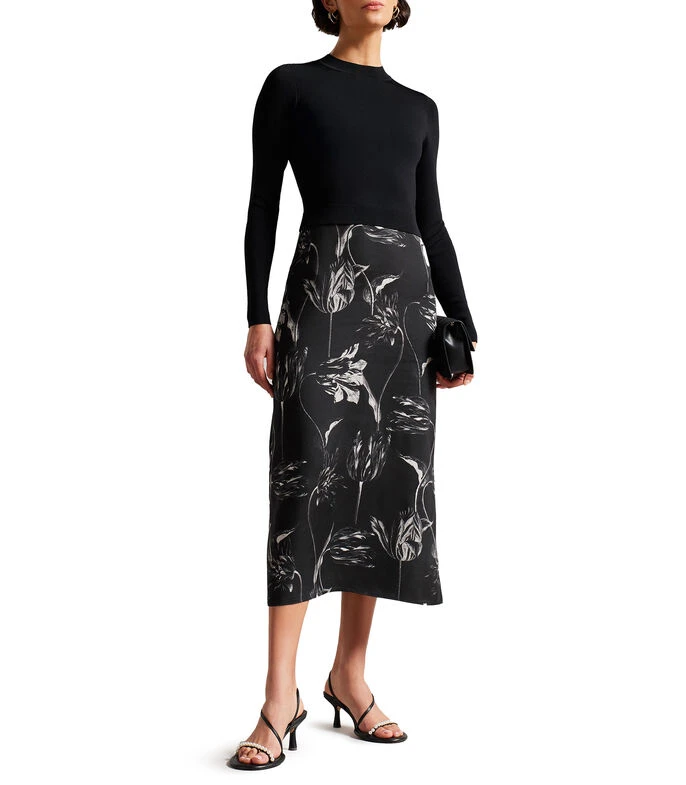 Vestido largo Ted Baker Alettaa de corte A en tejido plano, diseño floreado en falda, cuello redondo y manga larga.