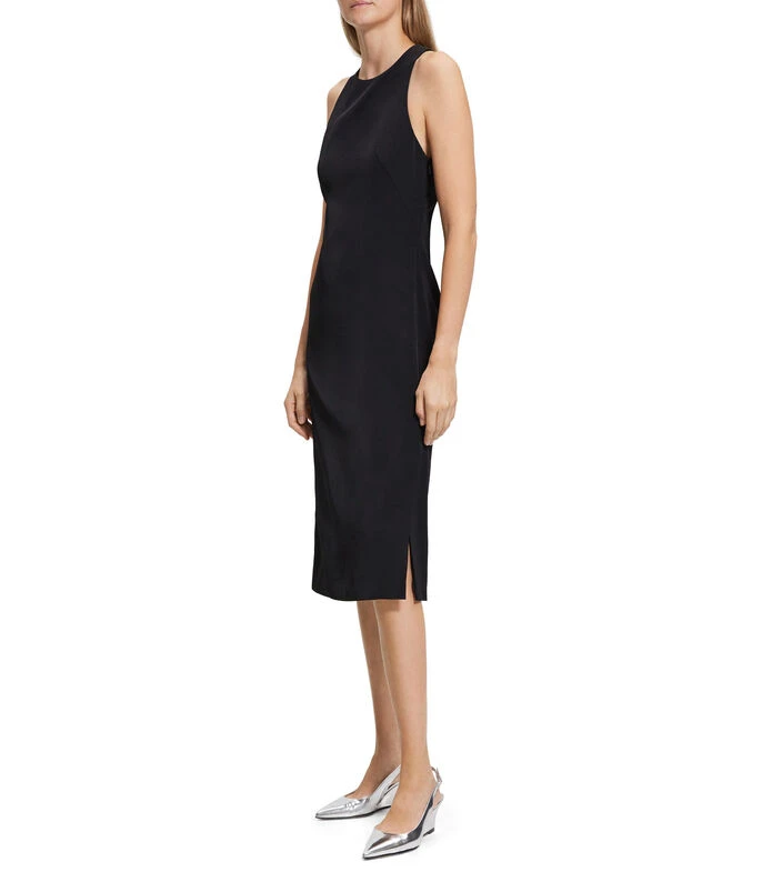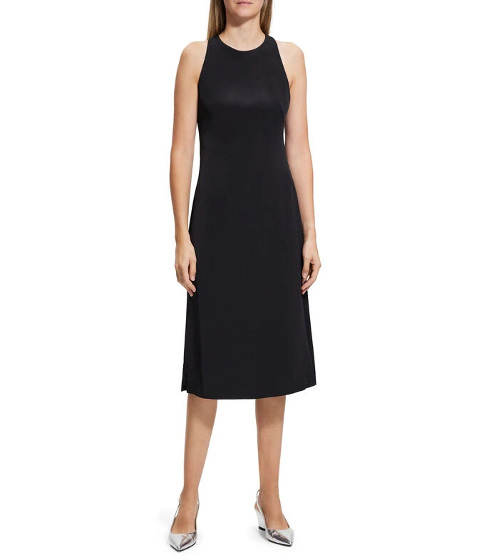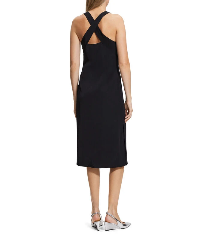 Vestido Theory midi de corte recto en tejido de punto, cuello redondo, tiras cruzadas de cuello a espalda, sin mangas y sutil abertura en bajo lateral.