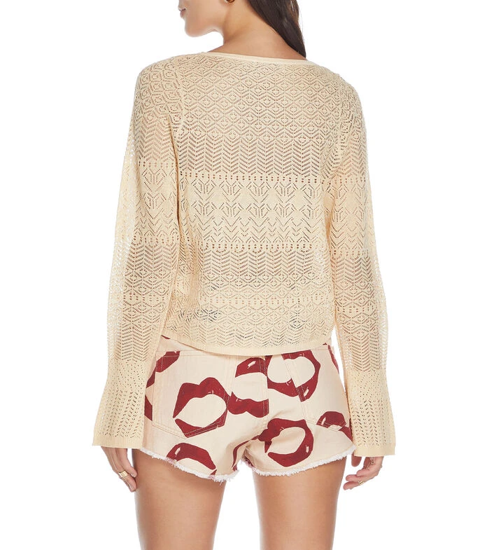 Top Jazmin Chebar en tejido en hilado fino con un efecto de diferentes motivos calados. Es una prenda de corte recto, con cuello redondo con manga larga acampanada. Ideal para una ocasión especial. Completa el look la Pollera Paris.
