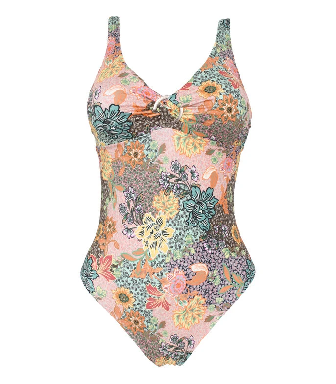 Traje de baño Zingara en tejido plano, cuello V, tirantes delgados, argolla en pecho y flores multicolor con cinta para anudar.
