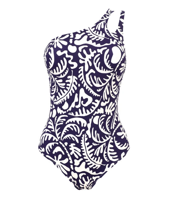 Traje de baño Zingara Kelp en tejido plano con estampado de hojas a contraste, cuello asimétrico sin mangas y abertura en espalda.