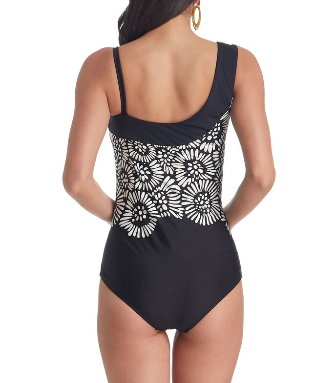 Traje de baño Barocco en tejido plano de secado rápido con full print, escote asimétrico y cintillo decorativo en hombro.
