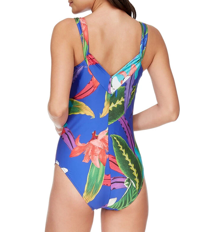 Traje de Baño Barocco Beauty en tejido plano floral a contraste, tirantes delgados desmontables, sobreposición decorativa al frente y en manga. Cuenta con 5 beneficios: reduce talla, realza busto, afina cintura, comprime abdomen y moldea glúteos. Además de protección solar.