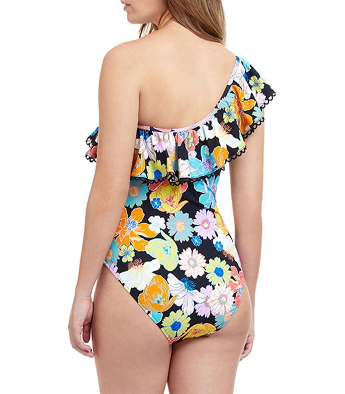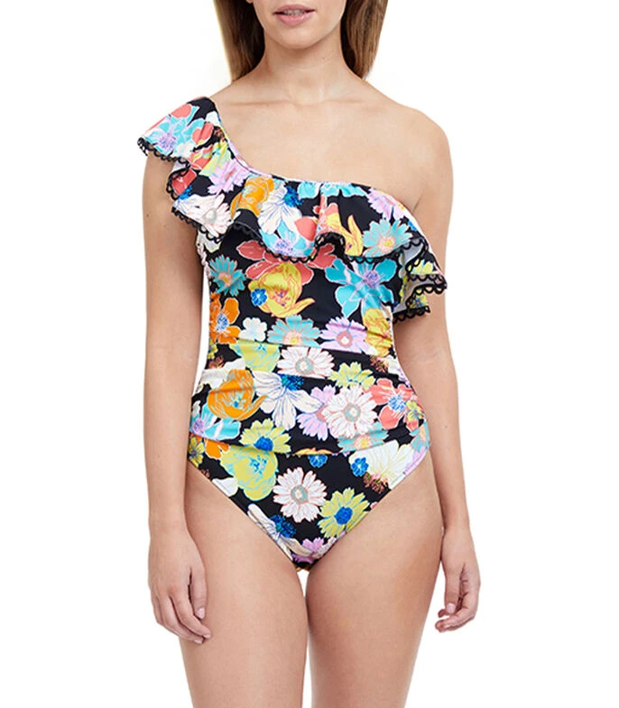 Traje de baño Gottex tipo mailot; en tejido plano, estampado de flores en color agua inspirado en la primavera con detalles de bucles en los escote, manga cruzada, copas suaves integradas y control abdominal. Con este traje de baño crea un look vanguardista.