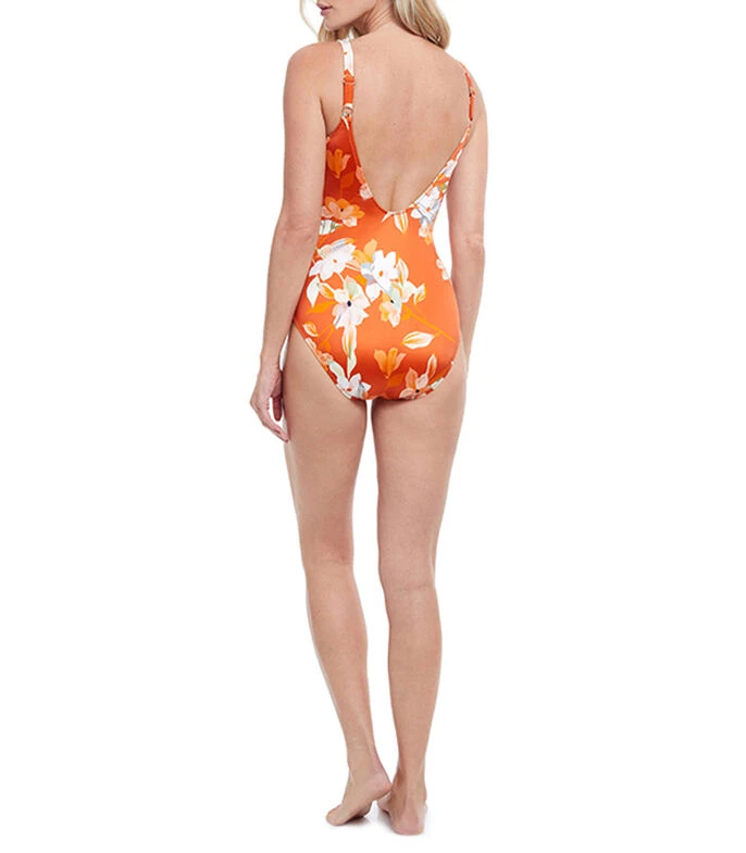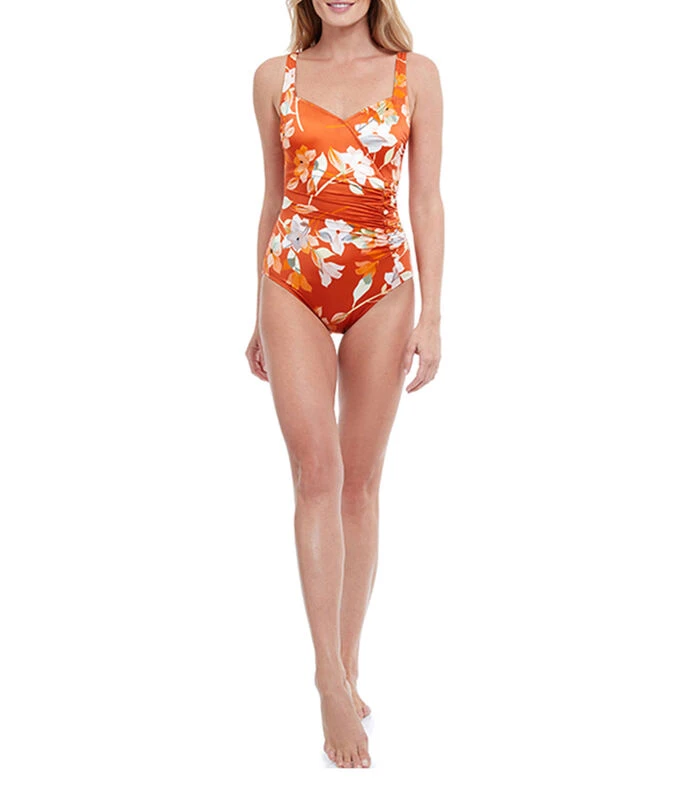 Traje de Baño Gottex estilo maillot con flores; Un femenino estampado de flores en combinaciones únicas con un motivo lateral fruncido y botones en bucle para realzar el cuerpo. Un tejido satinado y suave. Traje de baño con copas suaves, control abdominal y tirantes ajustables para mayor comodidad.