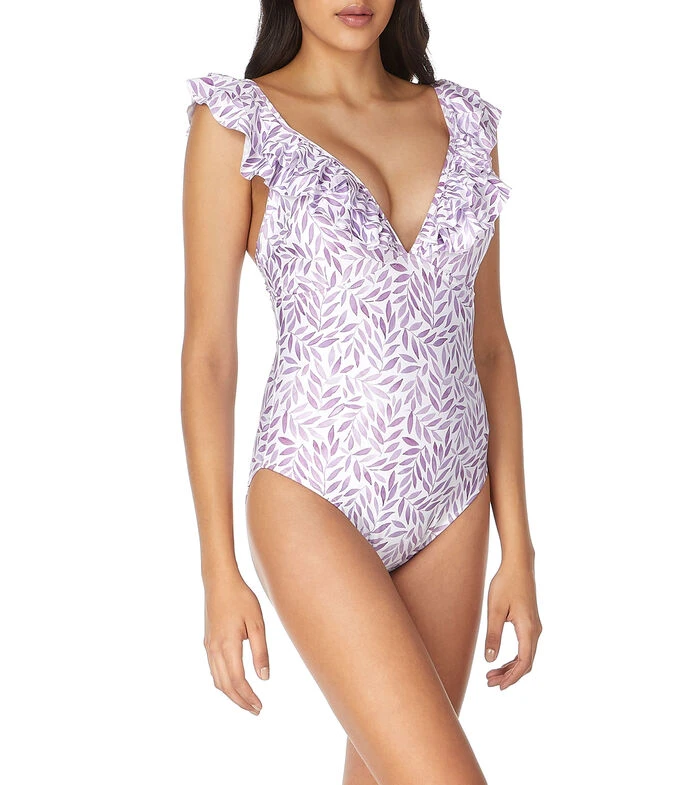 Traje de baño Barocco estilo maillot en tejido de punto con hojas, copa suave, holanes en el escote y hombros; tirantes ajustables y abertura sobre espalda.