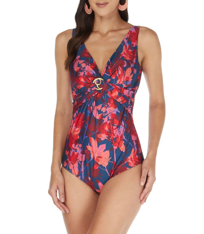 Traje de baño Maillot Barocco en tejido plano con estampado floral, cuello V y fruncido con anilla decorativa al frente.