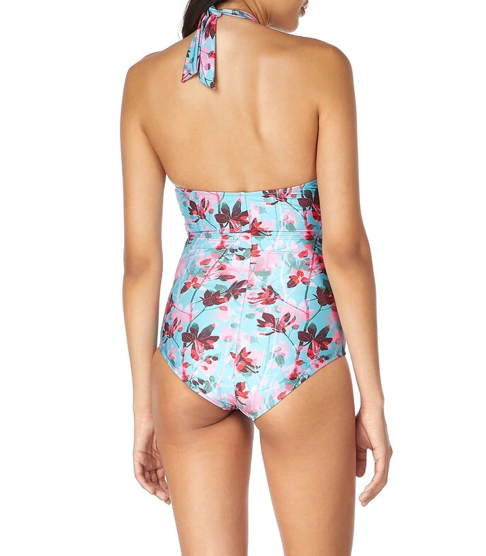 Traje de baño Barocco estilo maillot en tejido de punto con flores, copa suave, escote tipo halter, detalles plisados y abertura en la espalda.