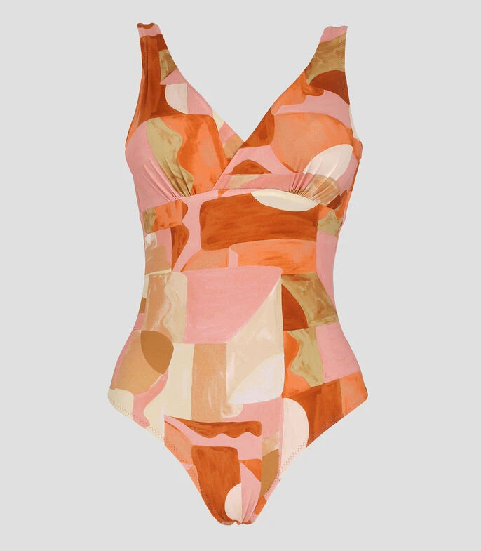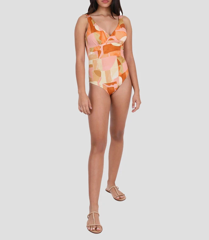 Traje de baño Zingara tipo maillot en tejido plano con estampado abstracto, tirantes, pliegues y escote en espalda.