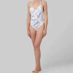Traje de baño Barocco estilo maillot en tejido de punto liso con holanes en mangas y detalle metálico sobre cintura frontal.