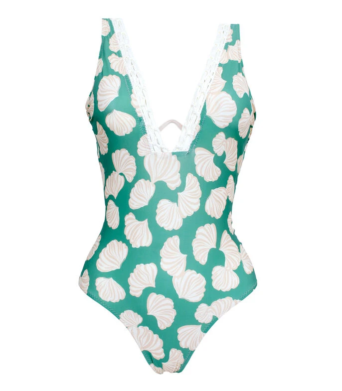 Traje de baño Zingara tipo maillot, de la colección Tamarix, en tejido plano con bordado tipo crochet en cuello, estampado fantasía y escote tanto frontal como en espalda.