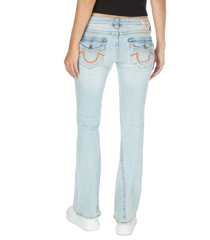 Jeans True Religion de corte flare en acabado teñido con deslavado, bragueta de cierre, sutiles pespuntes a contraste y bolsillos.