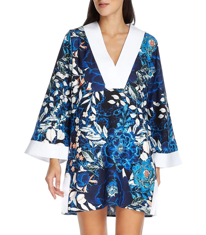 Túnica Barocco en tejido de punto con estampado floral, cuello V, manga larga y bordes a contraste.