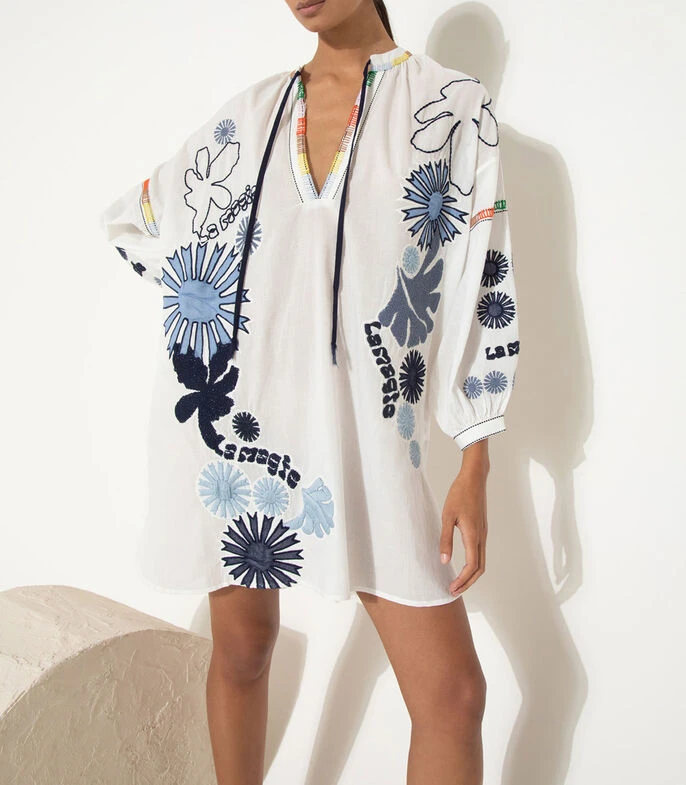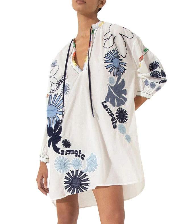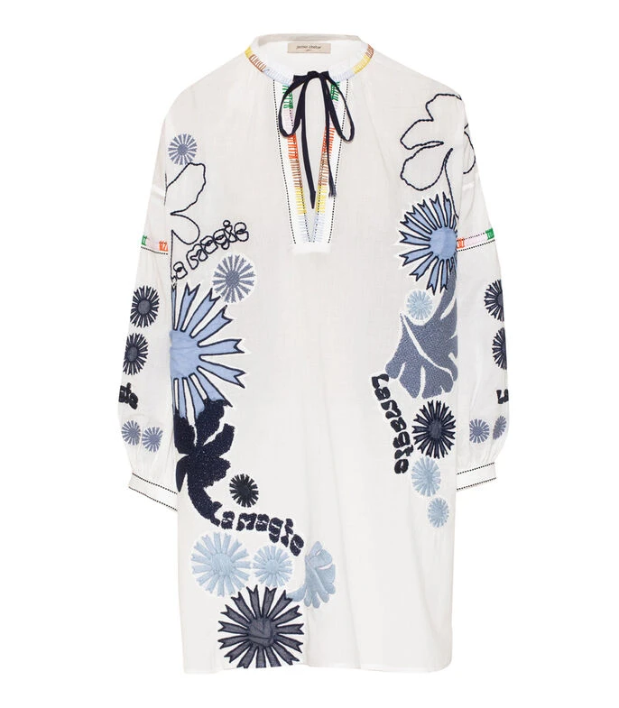 Túnica Jazmin Chebar Magic en tejido de punto con bordados La Fleur Magique, exclusivos de esta colección, a contraste, lazo ajustable en cuello, puño simple y aberturas sobre costados.
