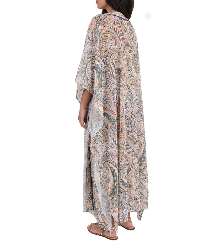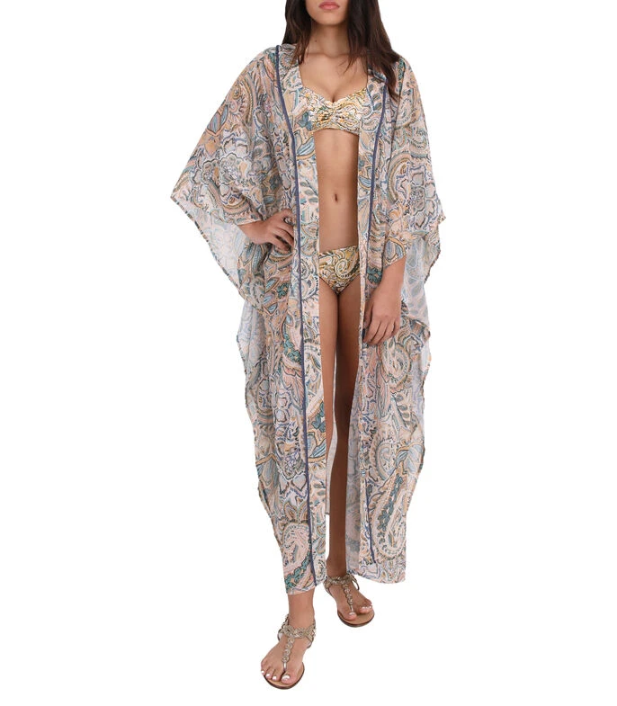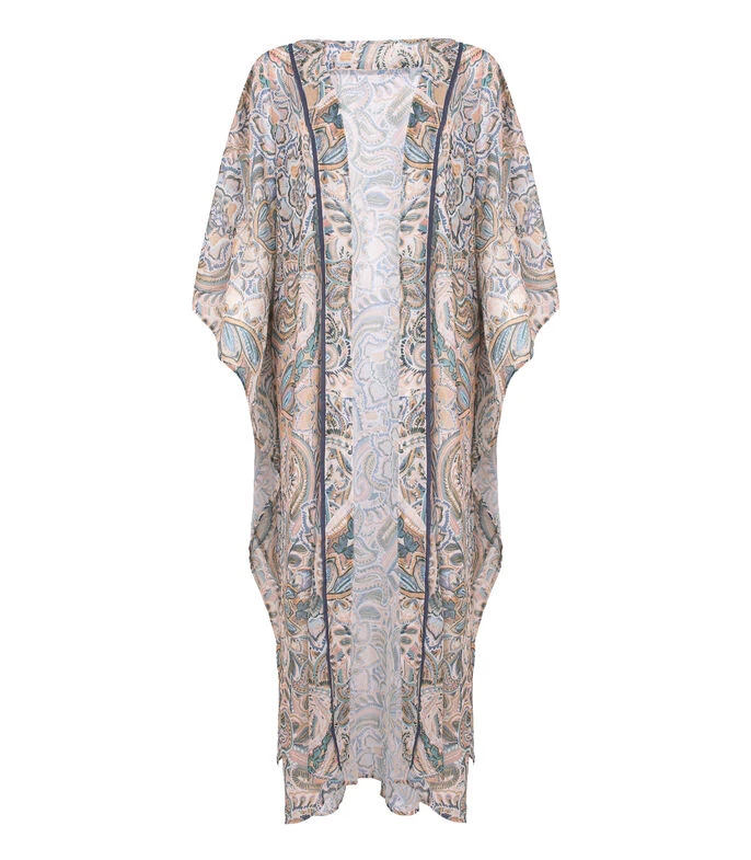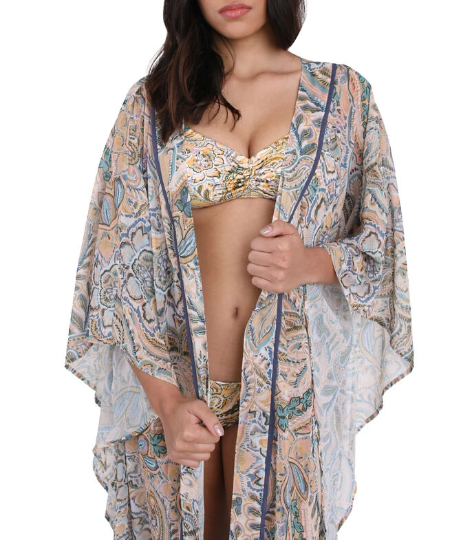 Túnica Zingara Pilea, en tejido de punto, cuello abierto, estampado floral y manga 3/4. Una prenda que te hará ver única en la playa. Úsalo a juego con el bikini top y bikini bottom.