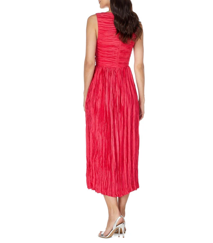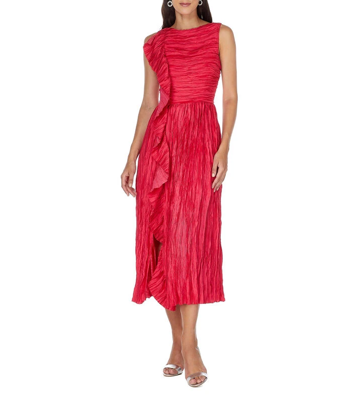 Vestido Ulla Johnson Midi de corte recto en tejido de punto con plisado en cuerpo, cuello redondo, holanes decorativos al frente, sin mangas y cierre de cremallera en espalda.