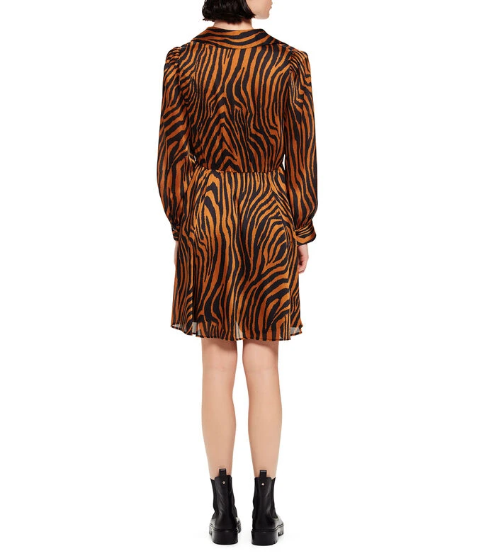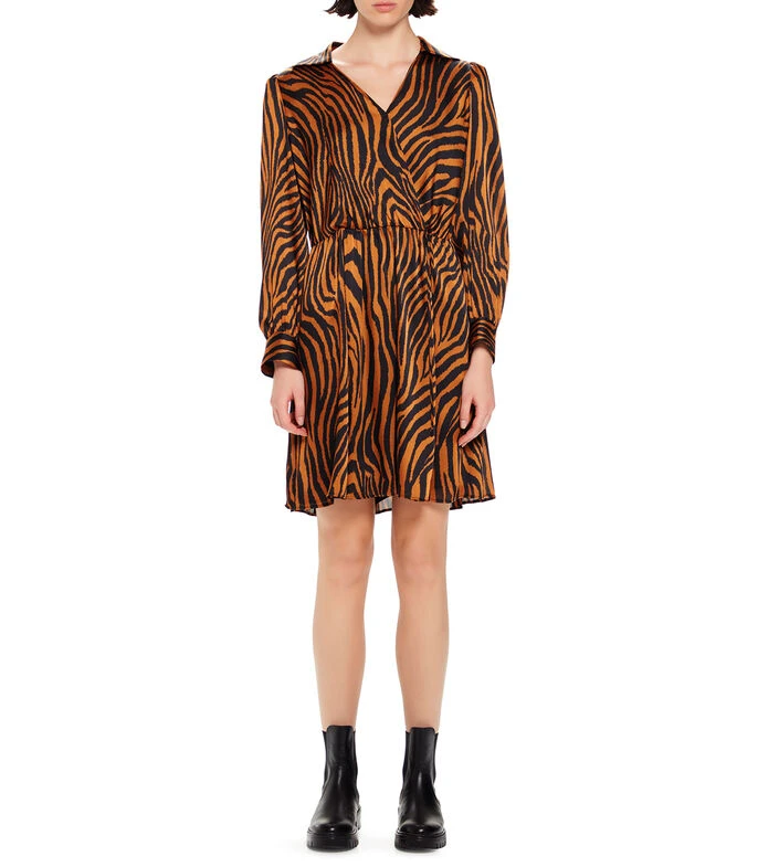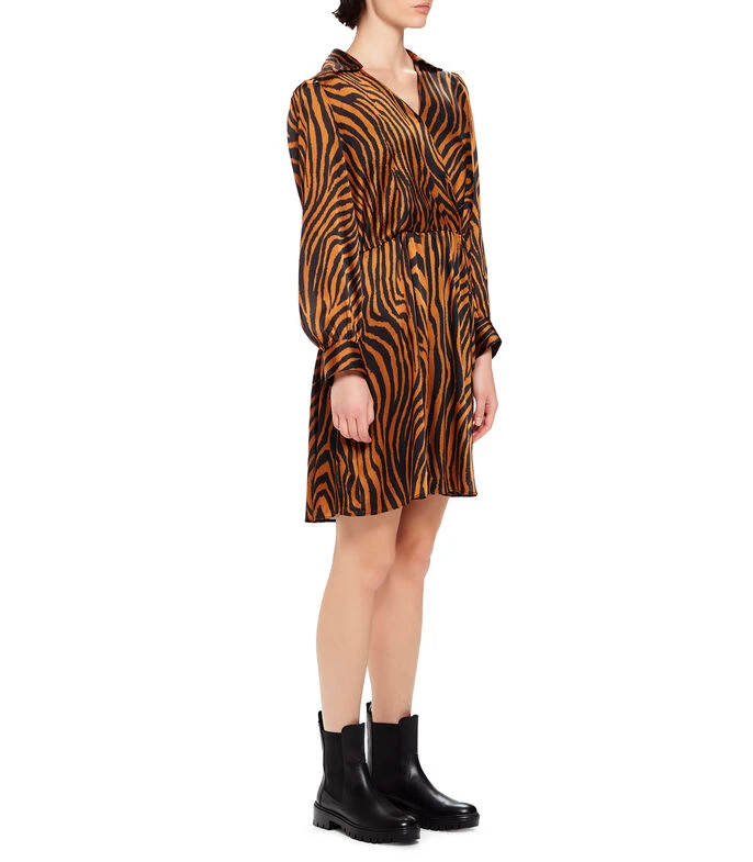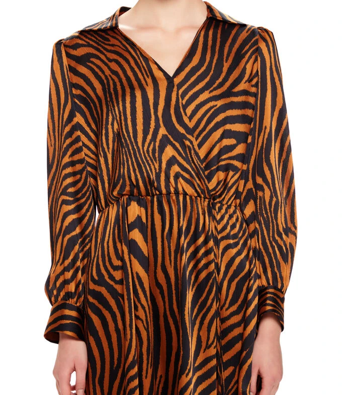 Vestido Julio midi de corte recto en tejido de punto, cuello V cruzado con solapa, manga larga con puño doble y estampado de animal print. El vestido envolvente de animal print con su llamativo patrón inspirado en la naturaleza salvaje, es un diseño audaz y elegante que se ha convertido en un clásico moderno. La combinación perfecta de sofisticación y sensualidad que, con el estilo envolvente, abrazan y resaltan la figura de una forma favorecedora.