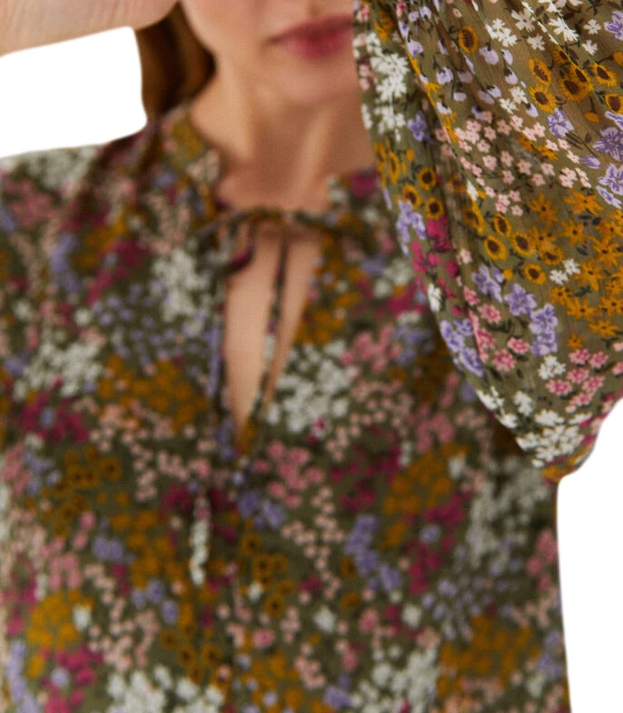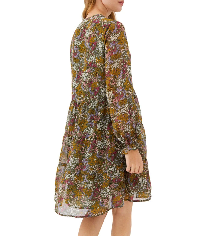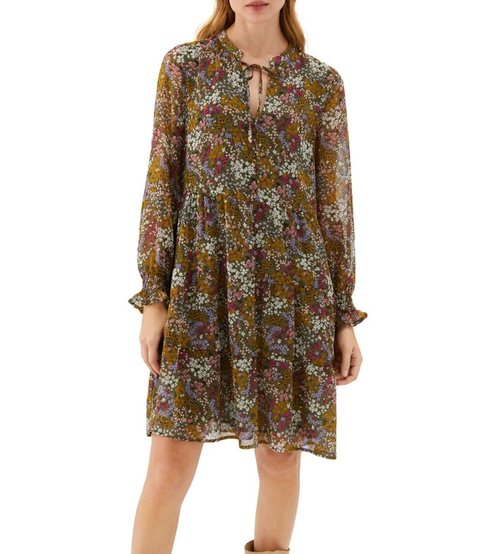 Vestido Cortefiel corto de corte «A» en tejido de punto con estampado floral fantasía, cuello «V» y manga larga con puños elásticos.