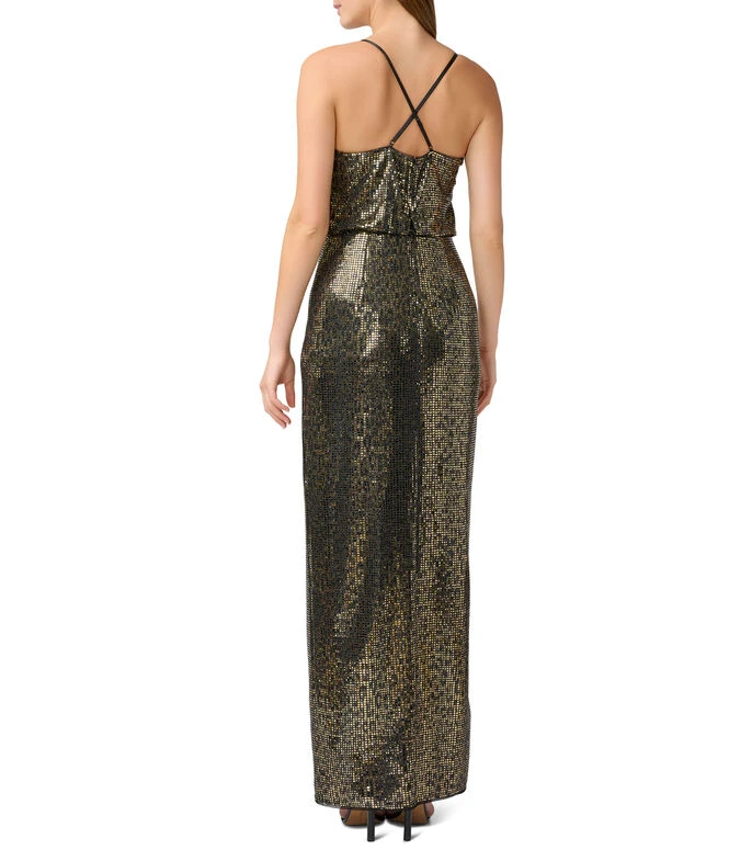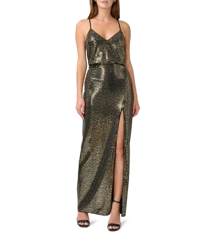 Vestido de fiesta Aidan by Aidan Mattox largo de corte recto en tejido plano de diseño fantasía, cuello «V», tirantes cruzados y abertura frontal.