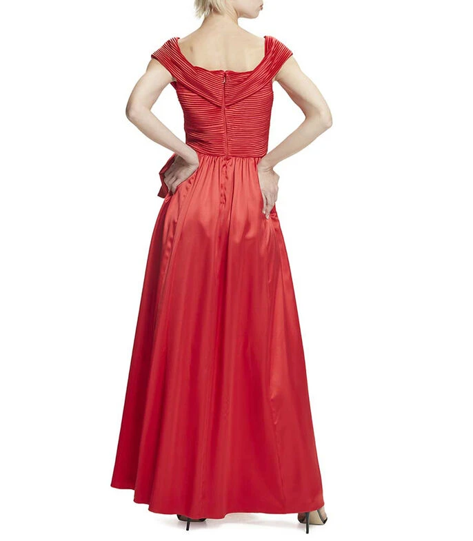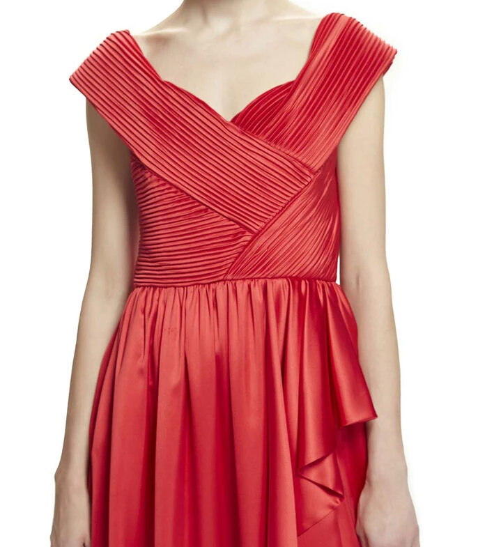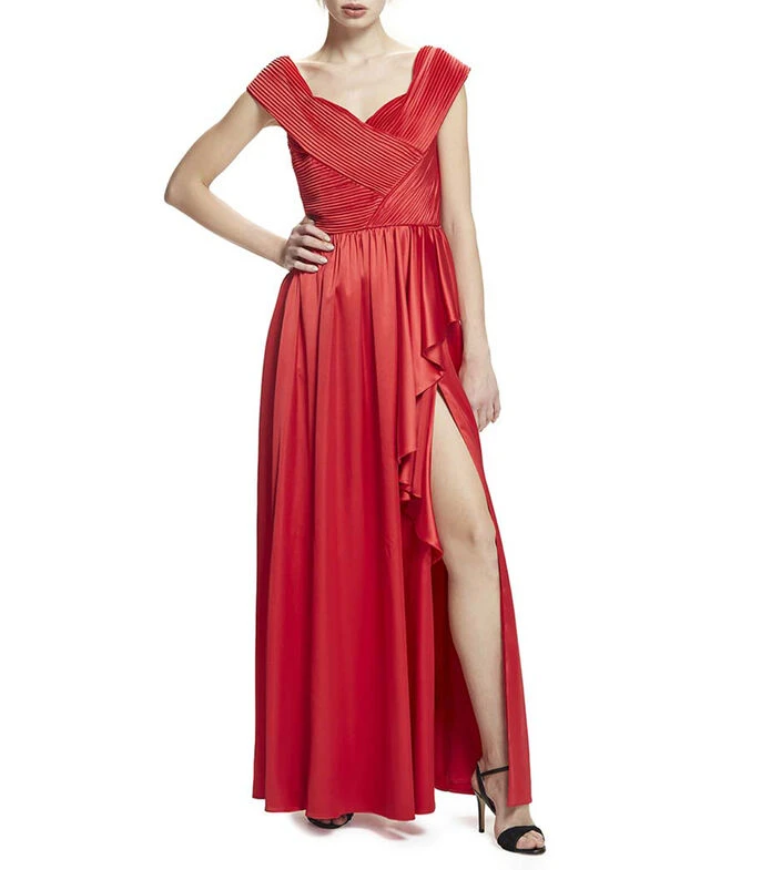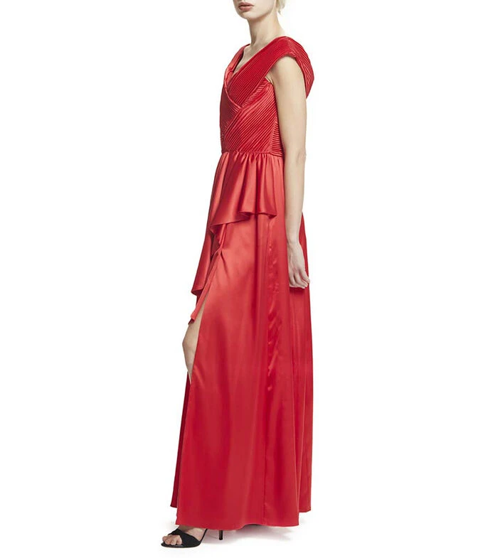 Vestido largo Julio Atelier de corte «A» en tejido plano tipo satín, plisado decorativo en pecho y abertura en costado.