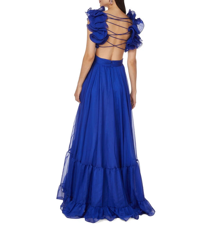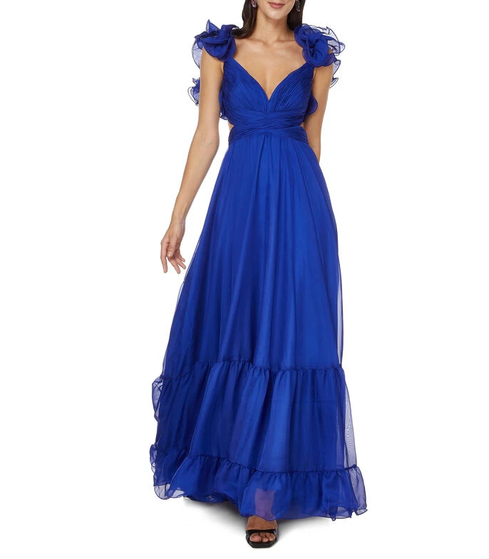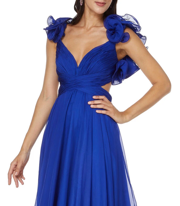 Vestido de fiesta Mac Duggal maxi de corte A en tejido de punto, plisados en costados y cintura; hombros con escarolas, abertura en la espalda y cierre en falda posterior.