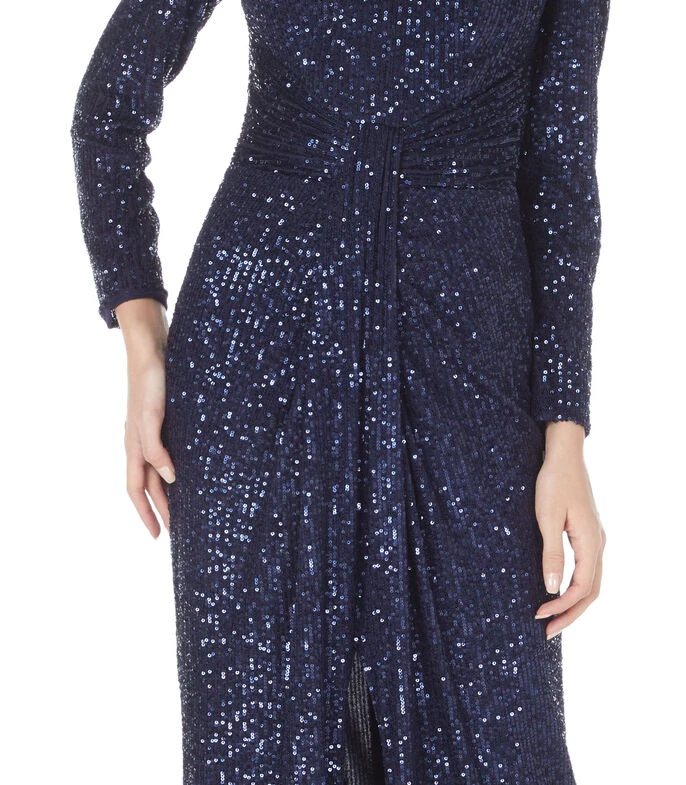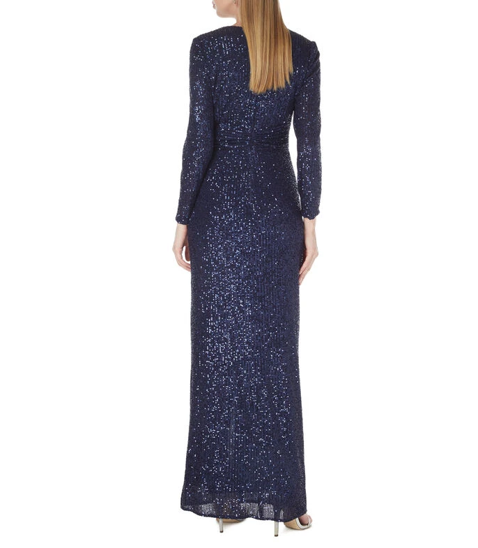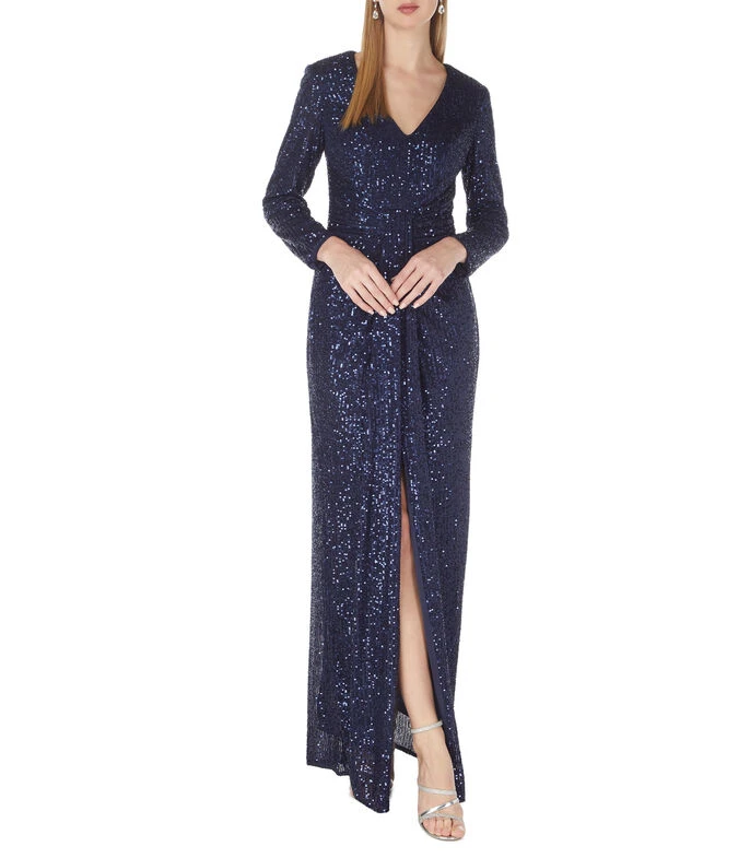 Vestido de fiesta Massima Maxi de corte imperio en tejido de punto con lentejuela decorativa, cuello V, manga larga y medio cierre de cremallera en espalda.
