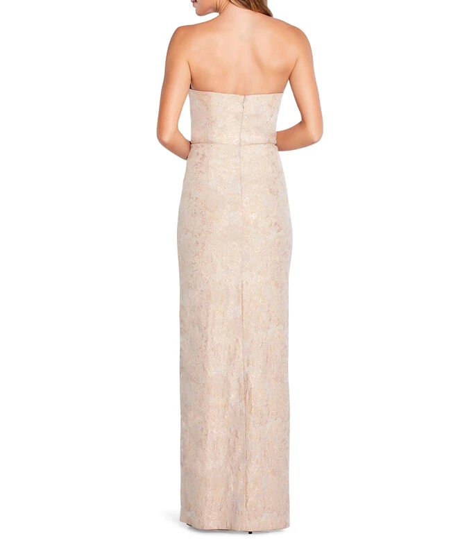 Vestido de Fiesta Aidan Mattox maxi de corte ajustado en tejido de punto con diseño a contraste, cuello strapless con abertura «V», sutil abertura al frente y cremallera oculta en parte posterior.
