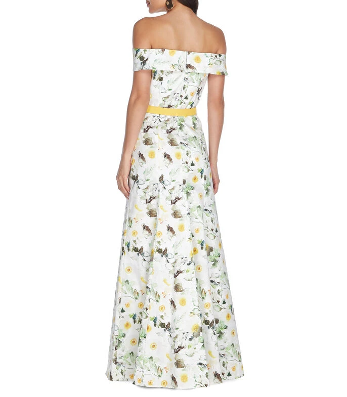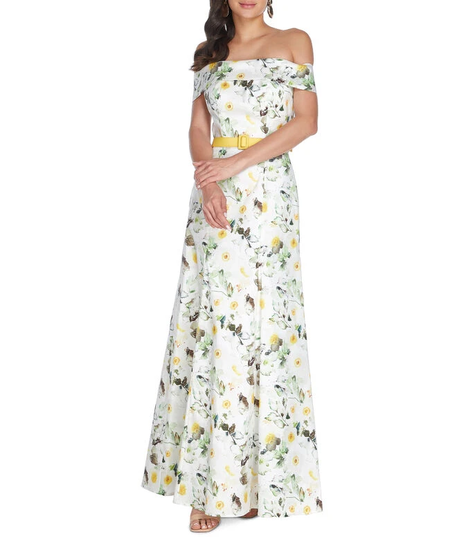 Vestido de fiesta Massima Maxi de corte imperio en tejido plano con estampado floral, escote bardot, sin mangas, cinturón de ajuste en cintura y medio cierre de cremallera posterior.