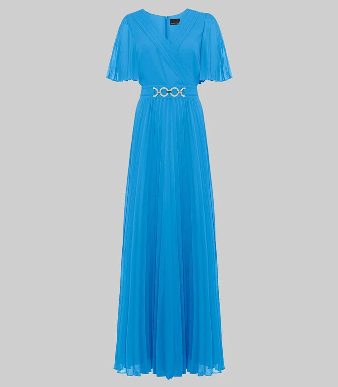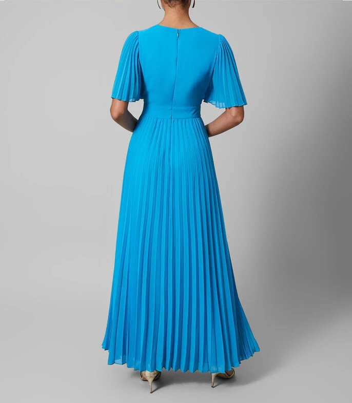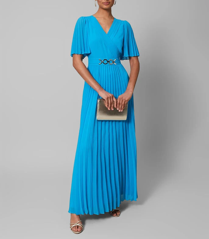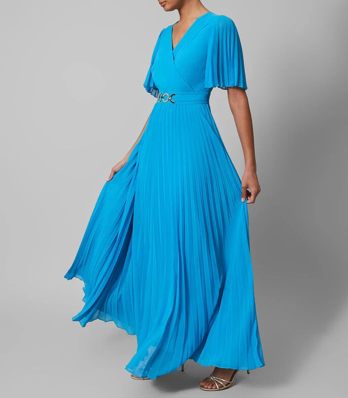 Vestido de fiesta Phase Eight Maxi de corte regular en tejido de punto con cuello V y manga corta; El vestido perfecto para tu próxima ocasión especial. Nuestro vestido Yasmina presenta mangas plisadas, un corpiño envolvente favorecedor y cae a una falda plisada completa que hace un movimiento maravilloso mientras caminas. Estilo con tacones plateados y un bolso de mano a juego.