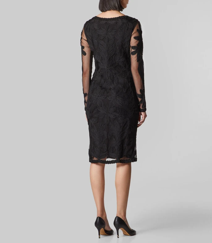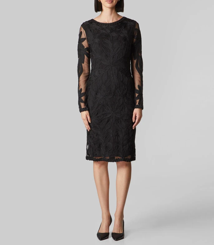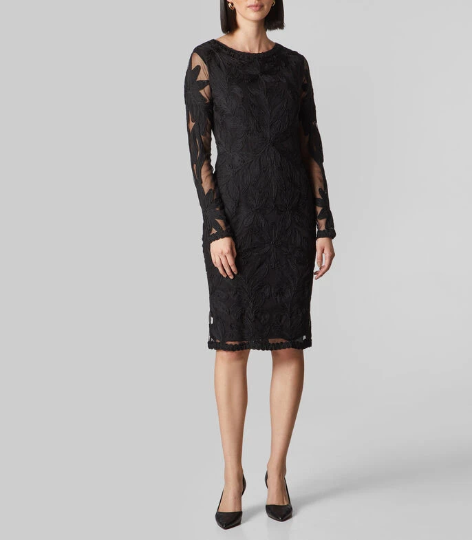 Vestido Phase Eight midi de corte ajustado en tejido de punto con bordado de flores, cuello redondo, medio cierre de cremallera en lateral y manga larga semitransparente; Con nuestro exclusivo diseño de encaje, este impresionante vestido está cosido a mano, lo que lo hace aún más especial. Las mangas de malla semitransparente completan el look.