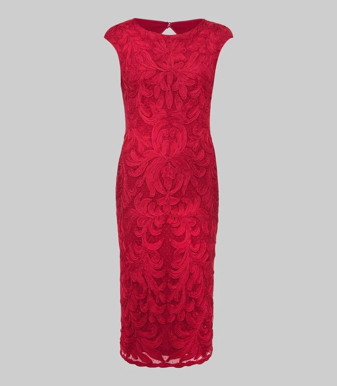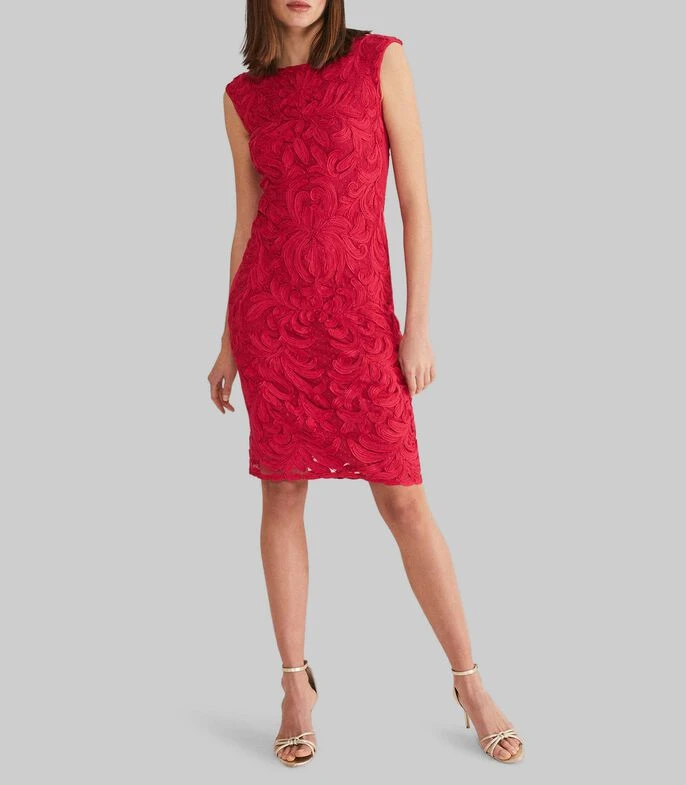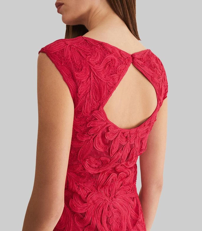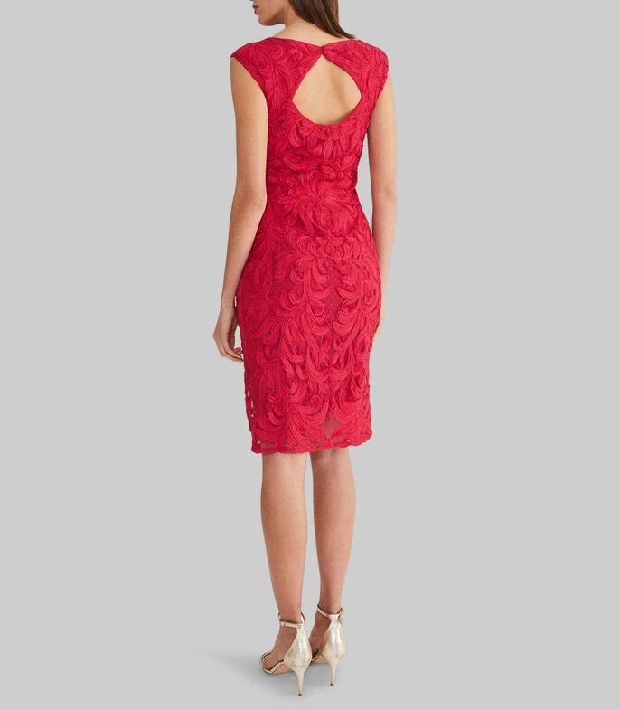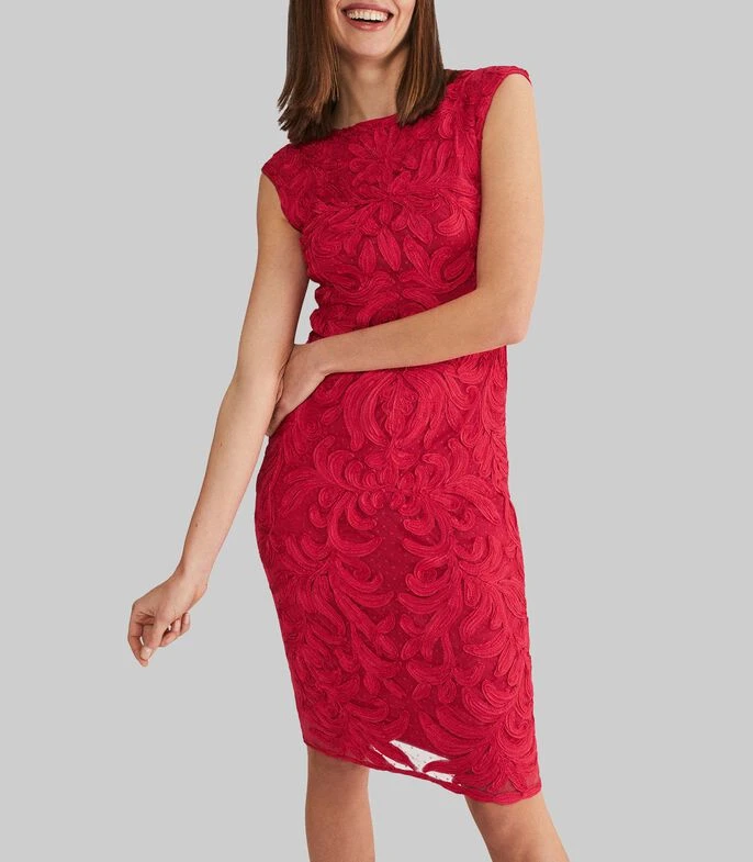 Vestido Phase Eight Tania midi, de corte regular en tejido de punto con flores, cuello redondo, abertura en espalda y cierre oculto; Un vestido elegante y atemporal para ocasiones especiales. Diseñado con delicado encaje, el vestido Tania tiene la espalda descubierta y escote redondo. Combínalo con tacones plateados y un bolso de mano para tu próximo evento.