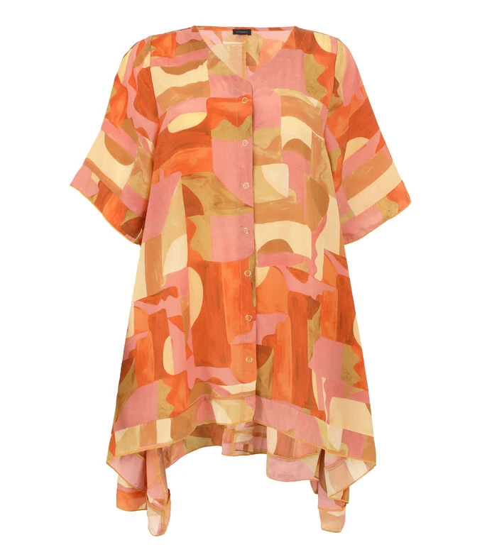 Vestido de playa corto Zingara asimétrico de corte amplio en tejido plano, estampado de cuadros y botonadura al frente.