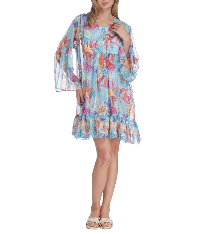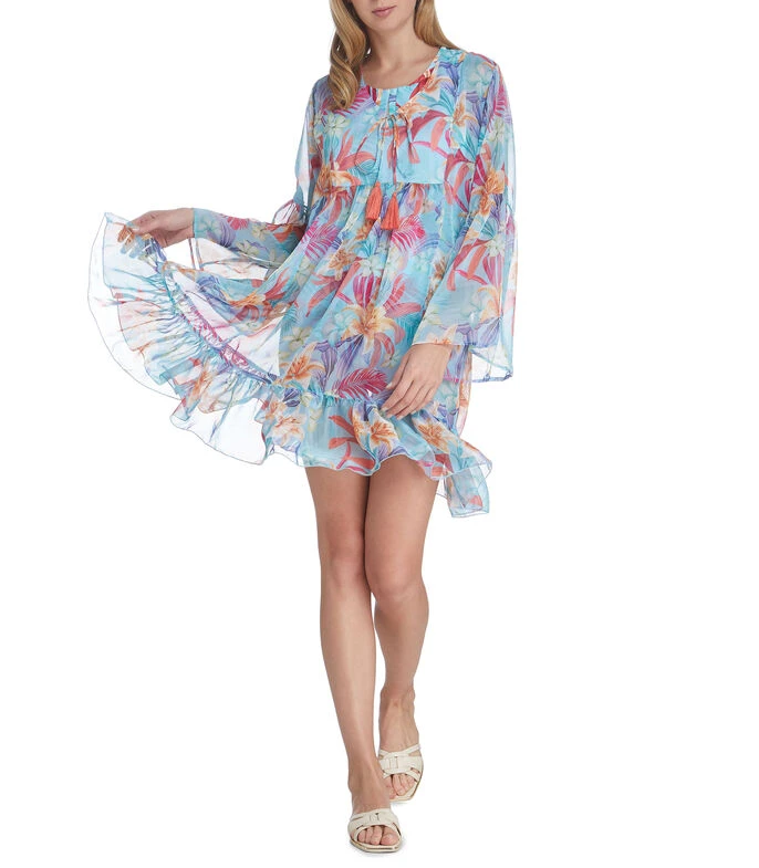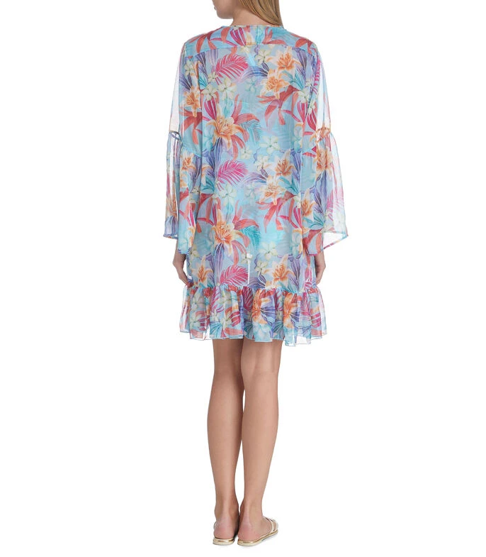 Vestido de playa Barocco corto en tejido plano con diseño decorativo de flores, acabado semitransparente, cuello V con cintas de ajuste y manga larga con detalle de olanes.