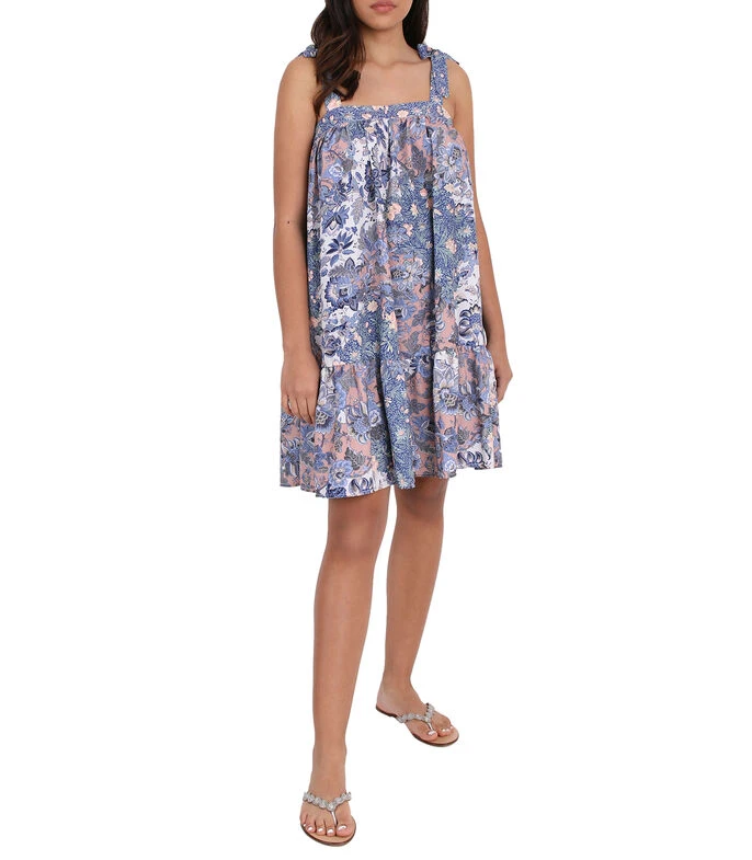 Vestido de playa corto Zingara de corte amplio en tejido de punto, estampado de flores y tirantes anchos que se anudan.