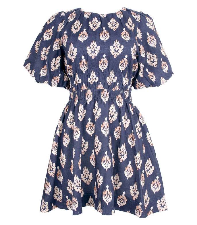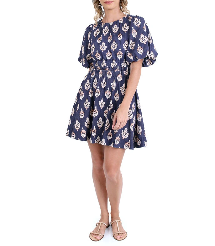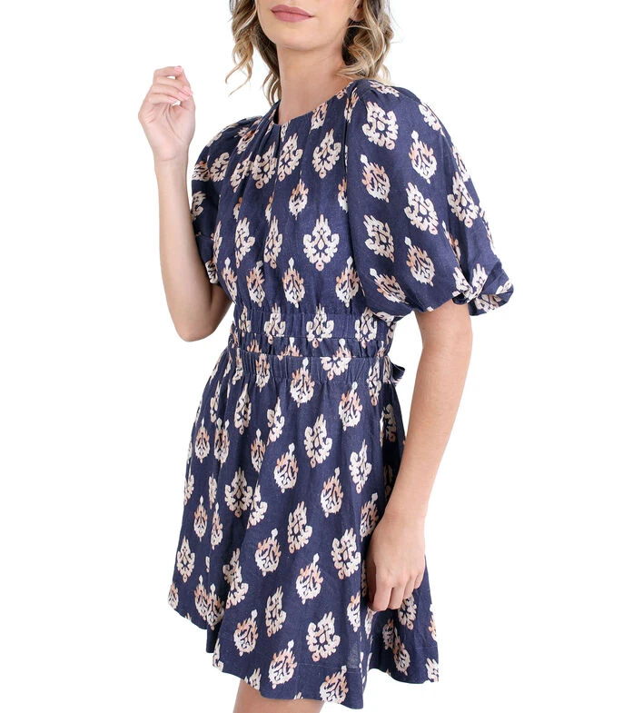 Vestido de playa Zingara Kilauea corto, de corte A en tejido de punto con estampado fantasía, cuello redondo, manga corta, espalda abierta y lazo en parte posterior.