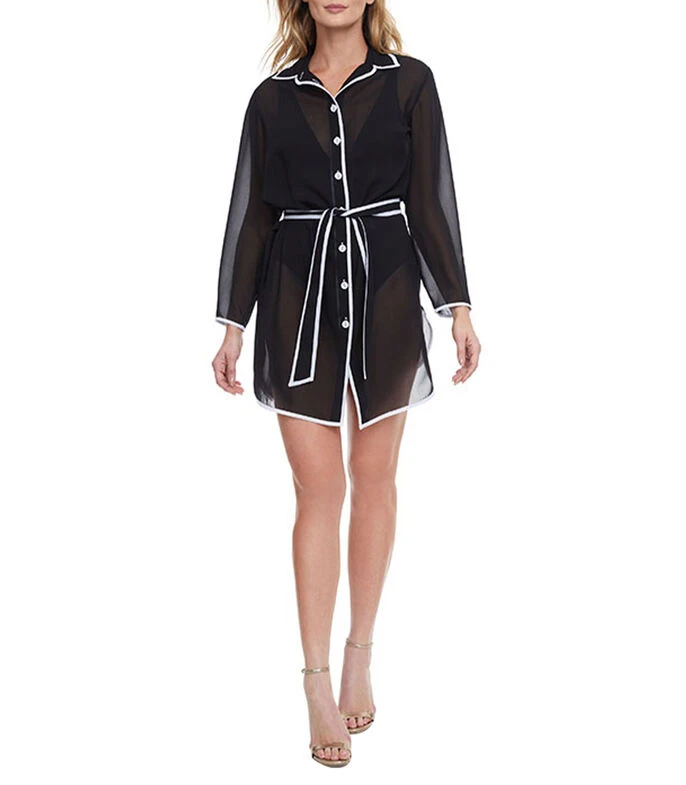 Vestido de playa Gottex corto de corte recto; en tejido de punto liso con acabado semitransparente, cuello camisero, manga larga, botonadura a contraste junto con bordes, cintilla en la cintura y aberturas a los costados.