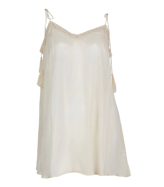 Vestido de playa Zingara corto de corte «A» en tejido de punto, cuello y escote «V», detalle calado y tirantes anudables con borlitas.