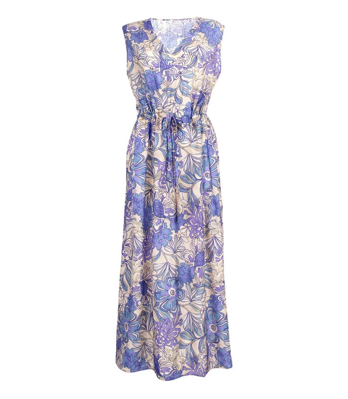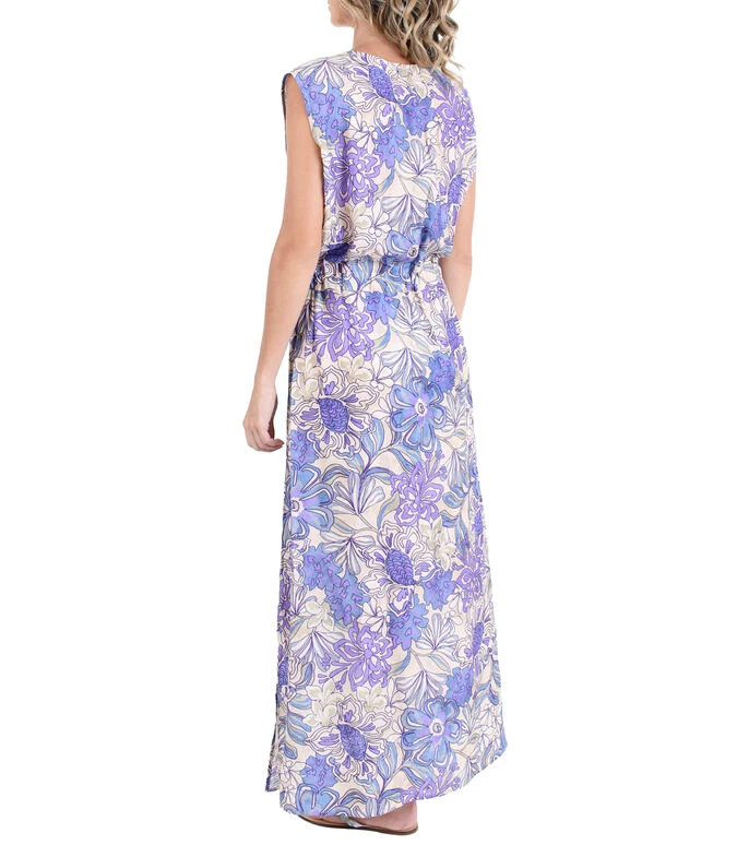 Vestido de playa Zingara Persea largo, de corte recto en tejido de punto con flores, cuello V, tirantes anchos y lazo al frente.