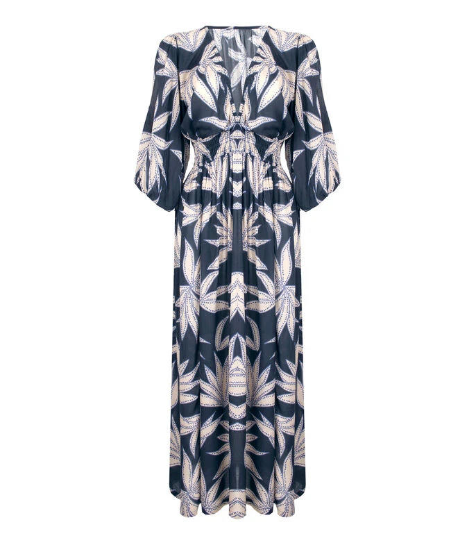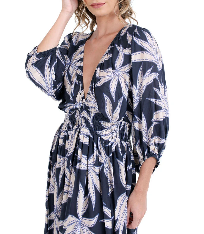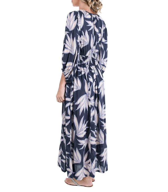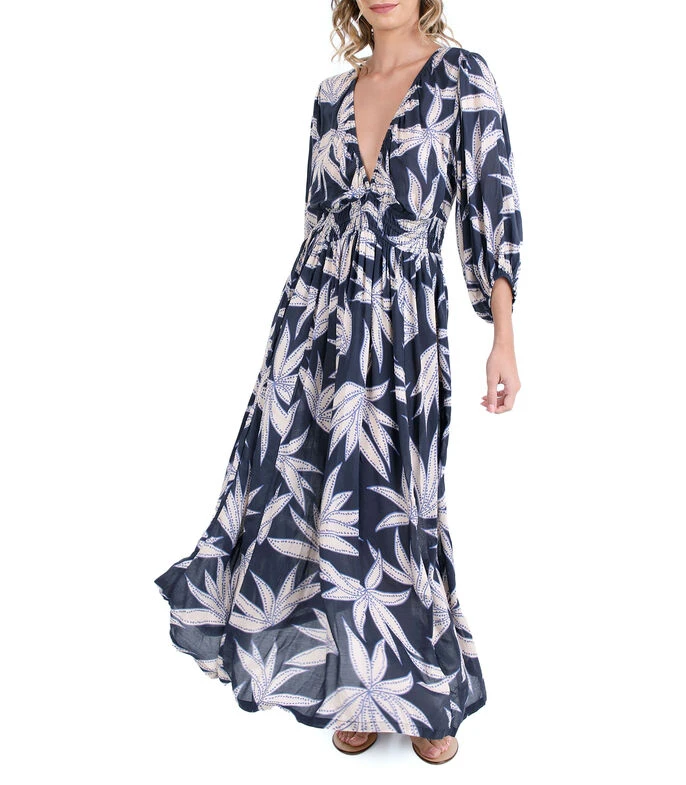 Vestido de playa Zingara Kentia largo, de corte recto en tejido de punto con hojas, cuello V, manga 7/8 y elástico en cintura.