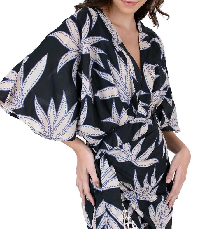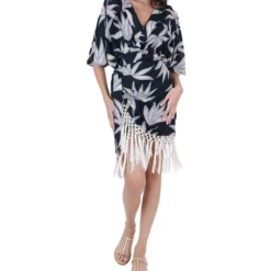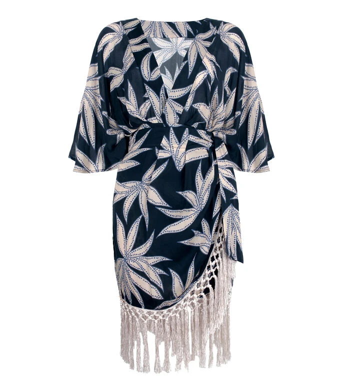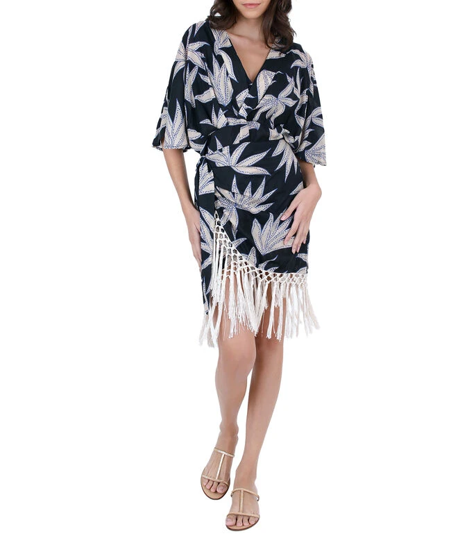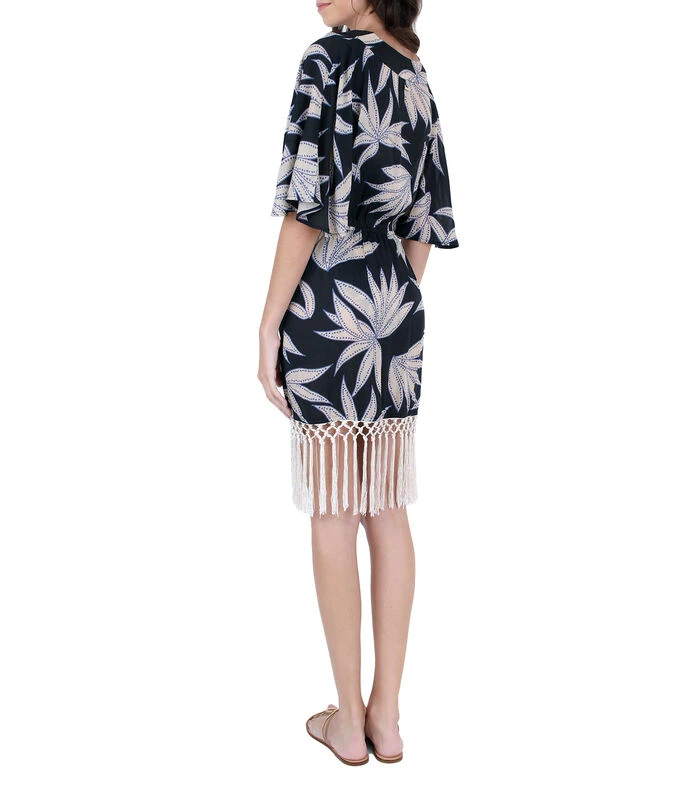 Vestido de playa Zingara mini de corte recto en tejido de punto con estampado de hojas y flequillos largos en el bajo.