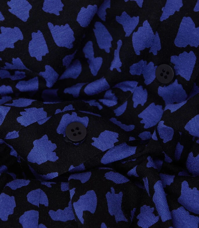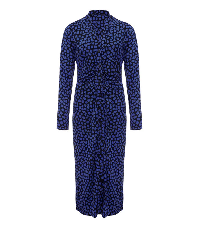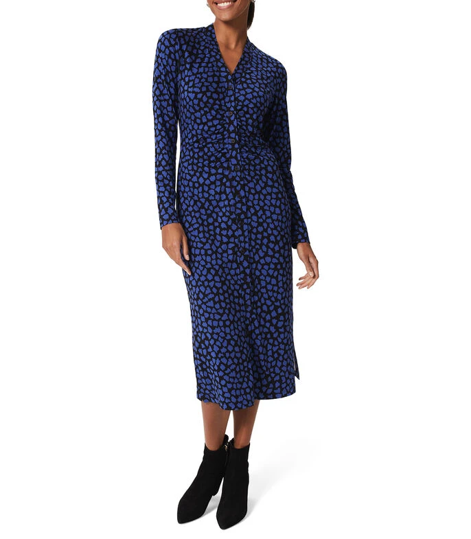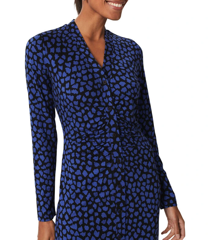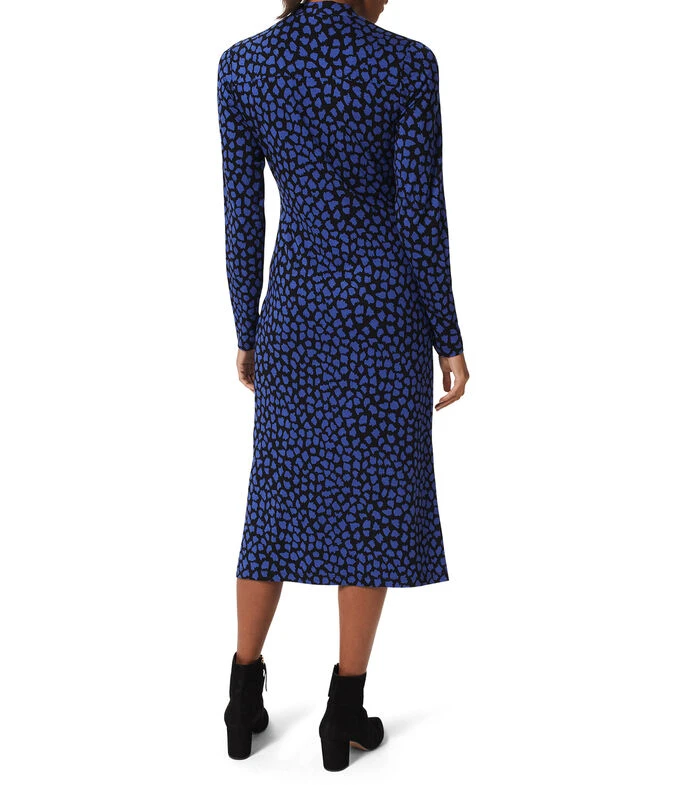 Vestido Hobbs largo de corte camisero en tejido de punto con diseño de manchas a contraste, escote V, manga larga y botonadura a contraste.