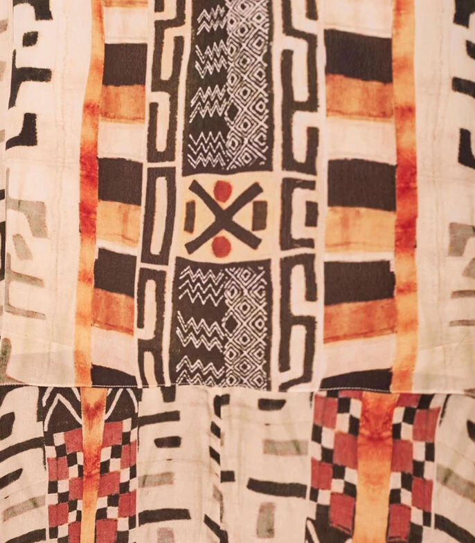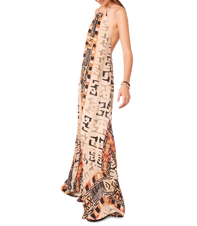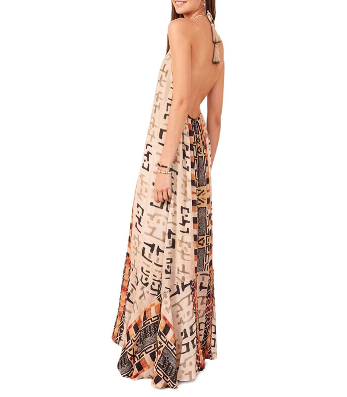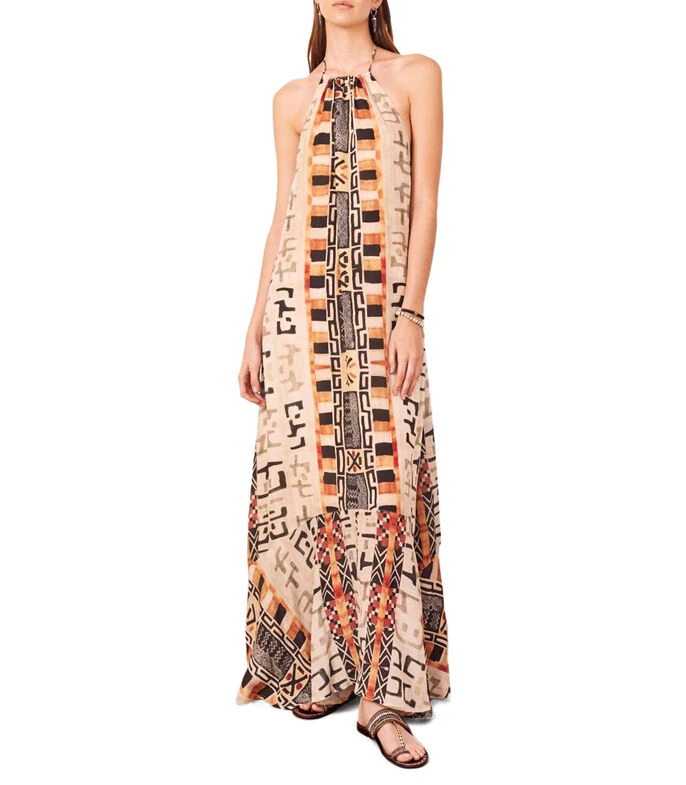 Vestido Rapsodia largo de corte amplio en tejido de punto con diseño estilo africano en mosaico, cuello halter, sin mangas y cordones para anudar.