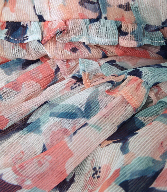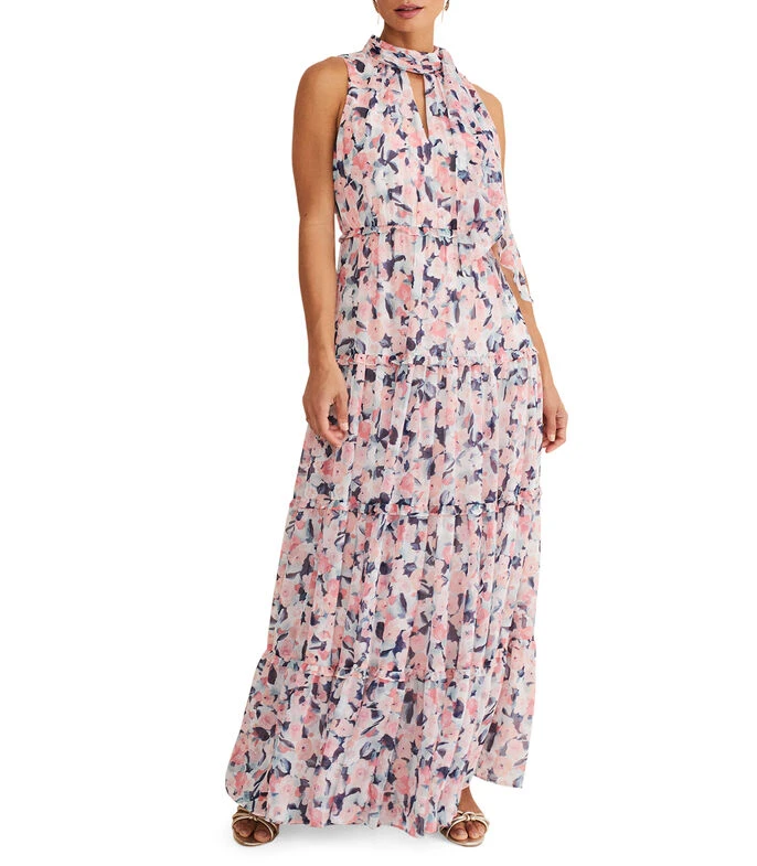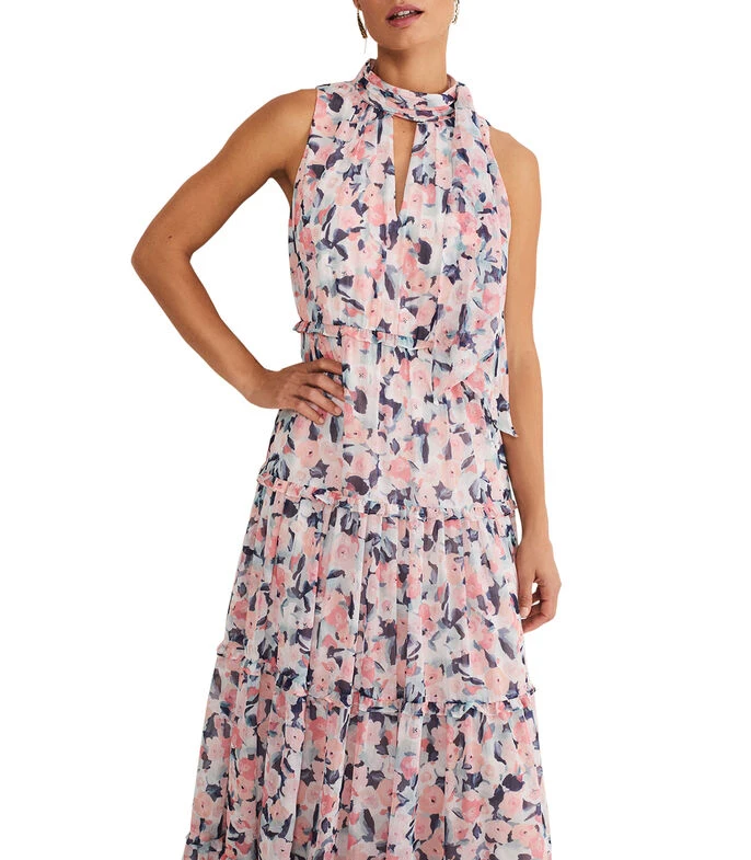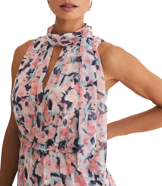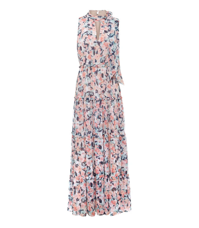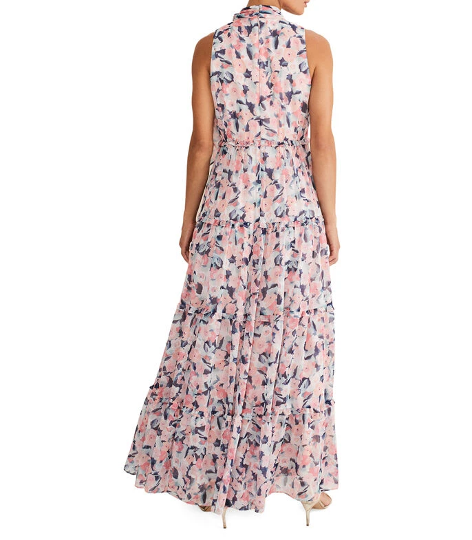 Vestido Phase Eight maxi de corte recto en tejido de punto, diseño decorativo de flores, cuello redondo con detalle de abertura, tirantes anchos, olanes en parte inferior y cremallera en espalda.