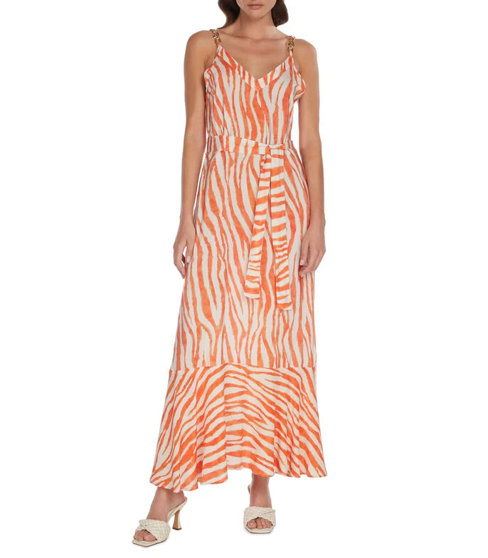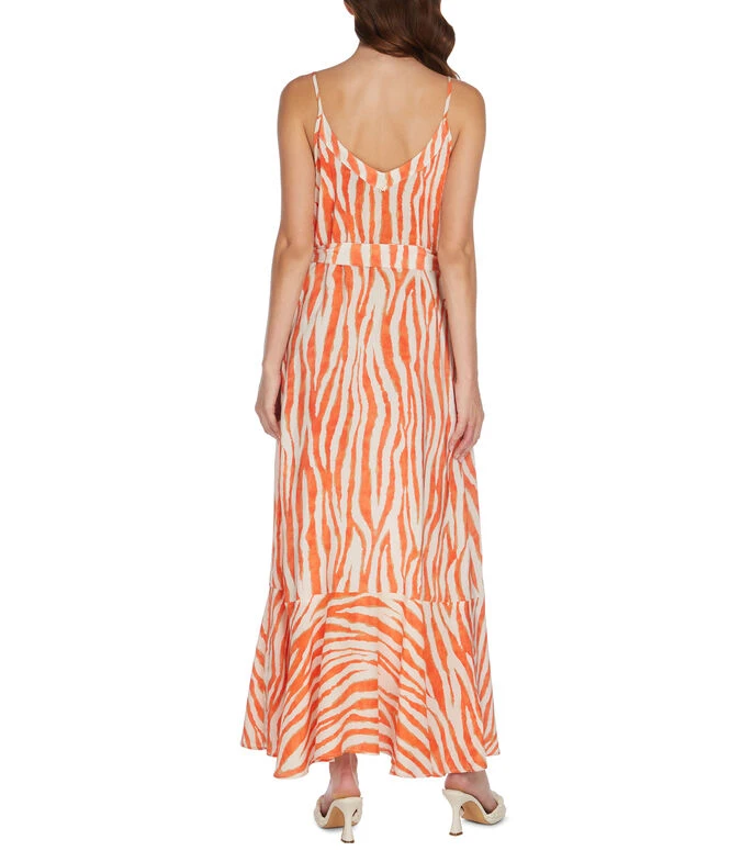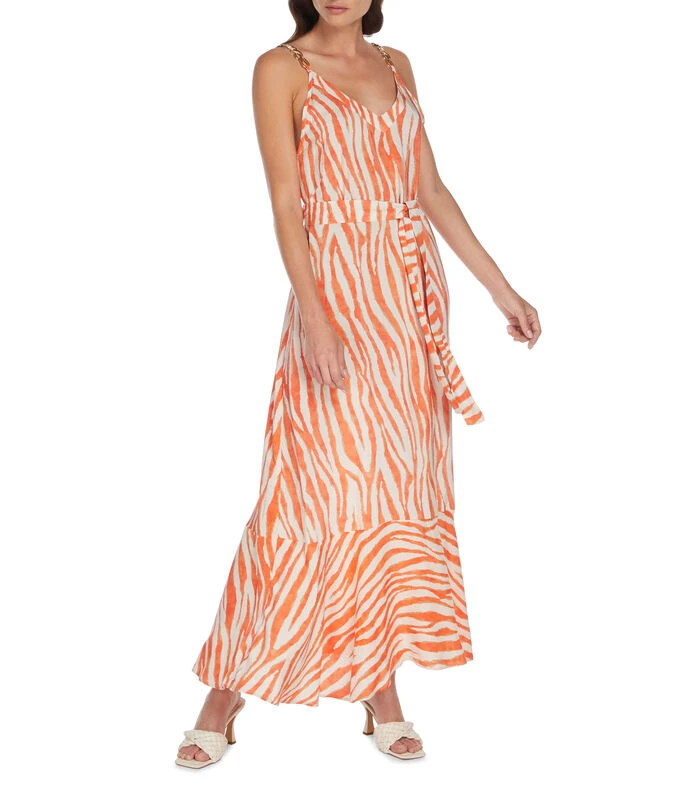 Vestido Lola Casademunt maxi de corte recto en tejido de punto con estampado de cebra, tirantes combinados y lazo ajustable sobre cintura.