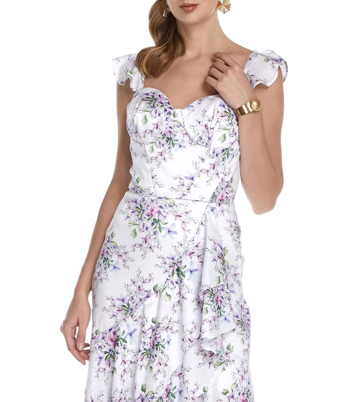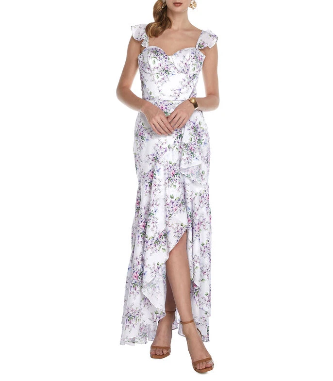 Vestido Massima maxi de corte recto en tejido de punto con flores estampadas, copa suave, volantes sobre hombros y cierre oculto en la espalda.